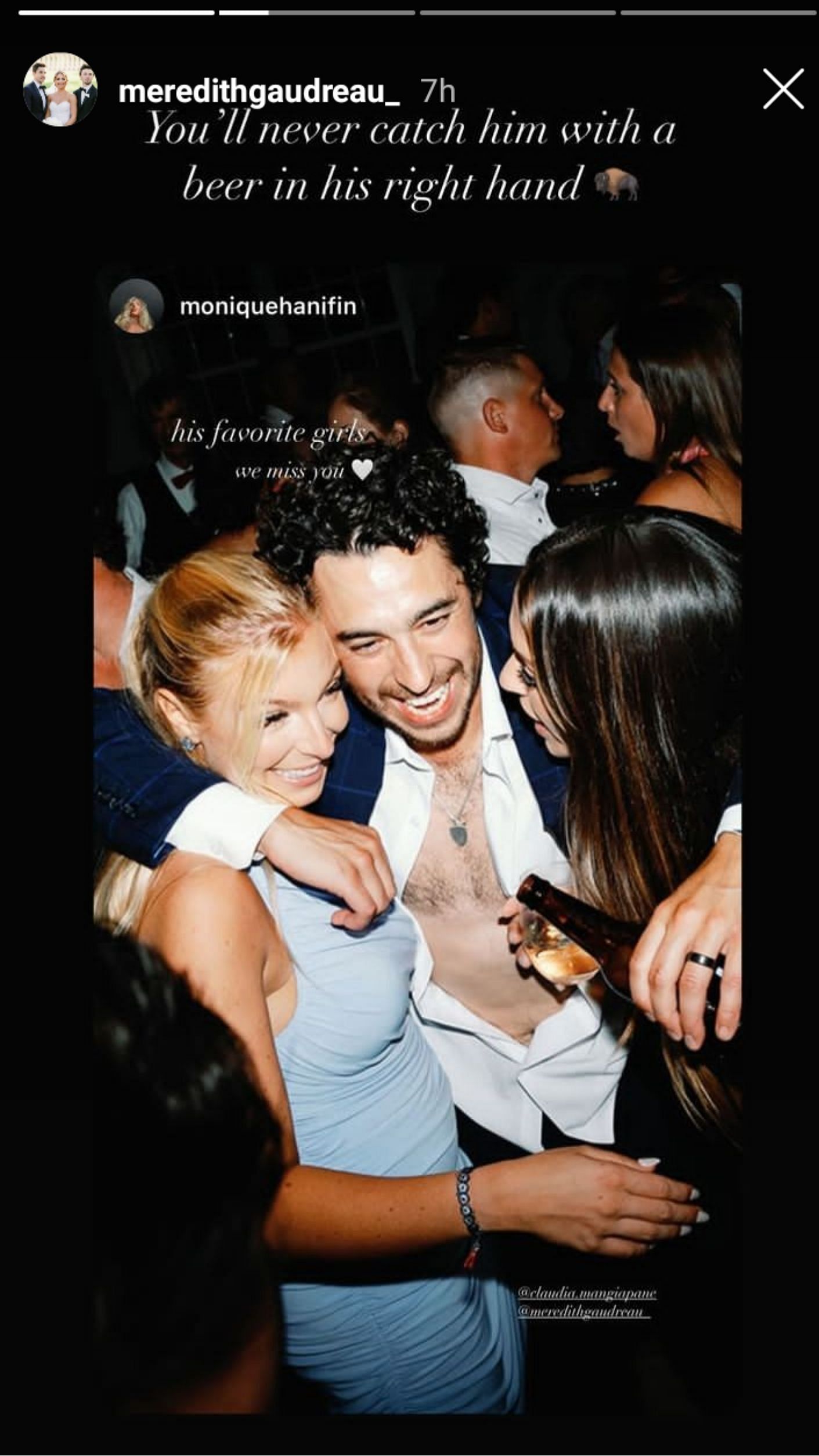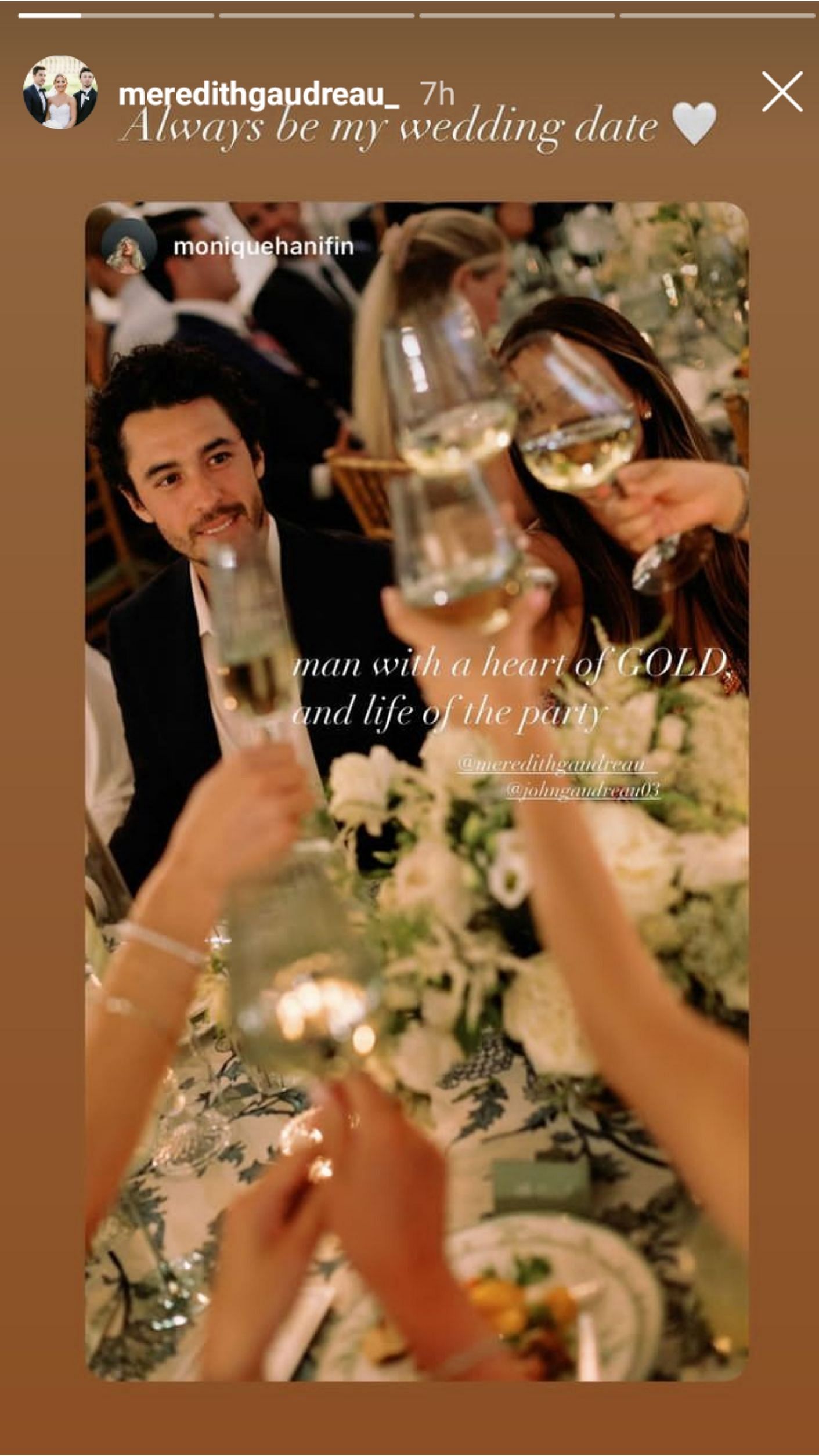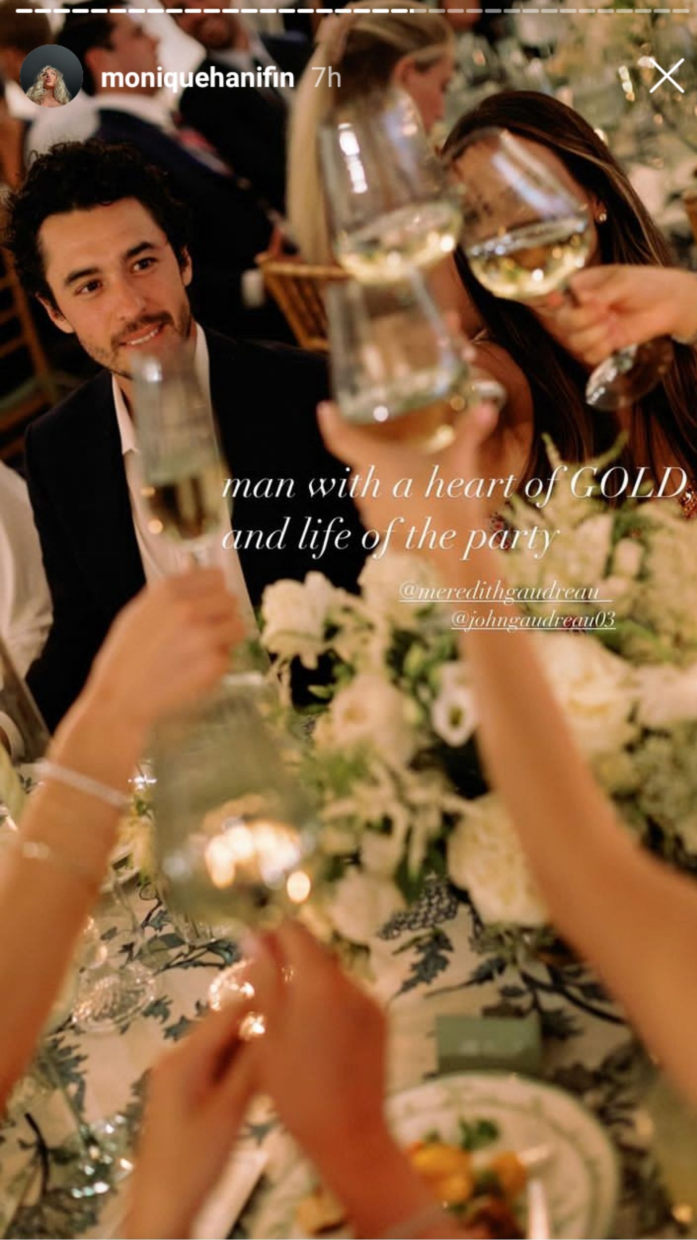 On Thursday, Meredith Gaudreau reposted a photo originally shared by Monique Hanifin on her Instagram story. The picture, taken at the Hanifins' wedding, saw Johnny Gaudreau raising the toast with other guests. Monique captioned the original post, writing: