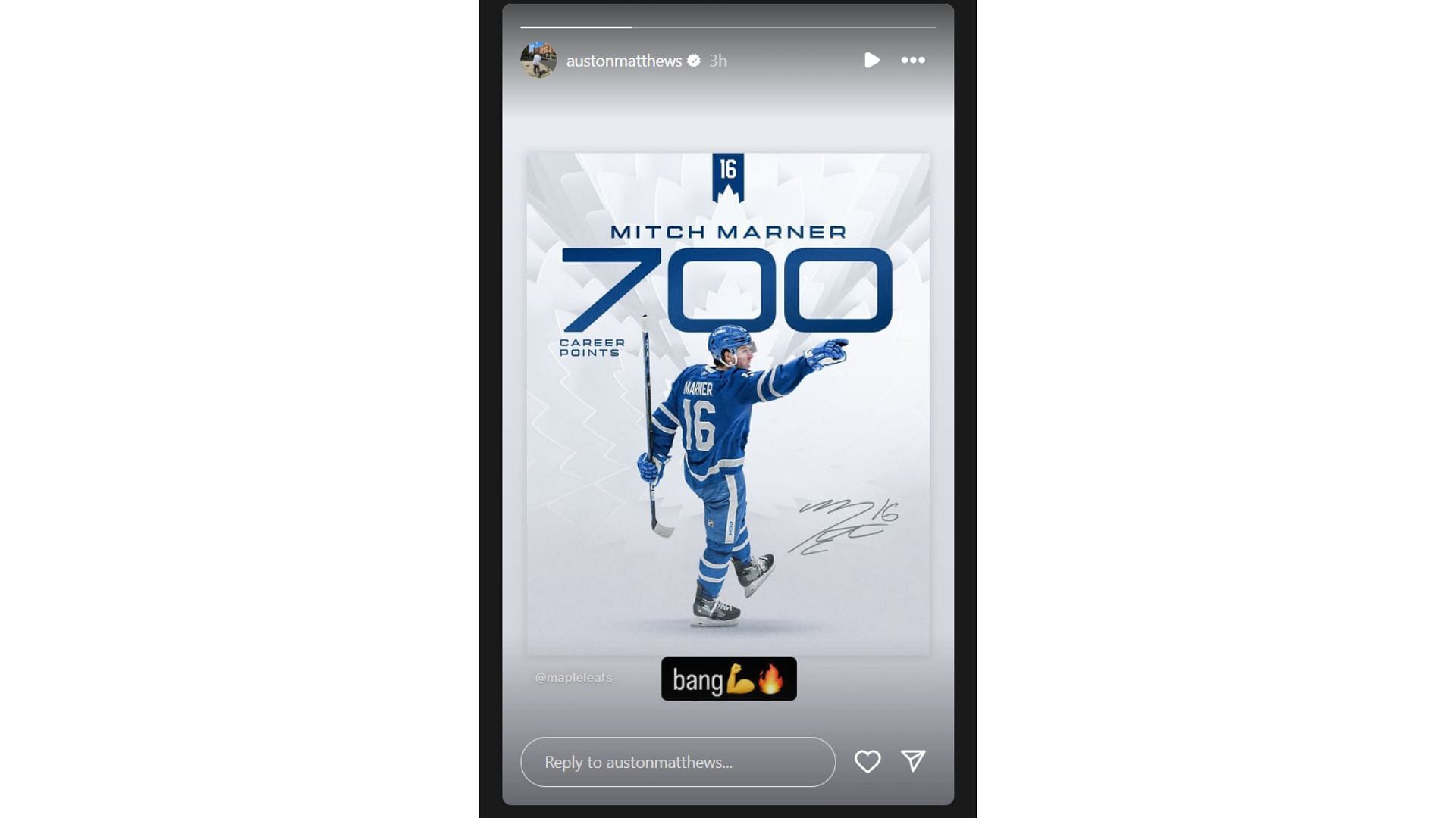 His teammate Auston Matthews took to Instagram to celebrate Marner reaching 700 points. He gave a one-word reaction, writing 'bang' along with two emojis that showed his elation.
