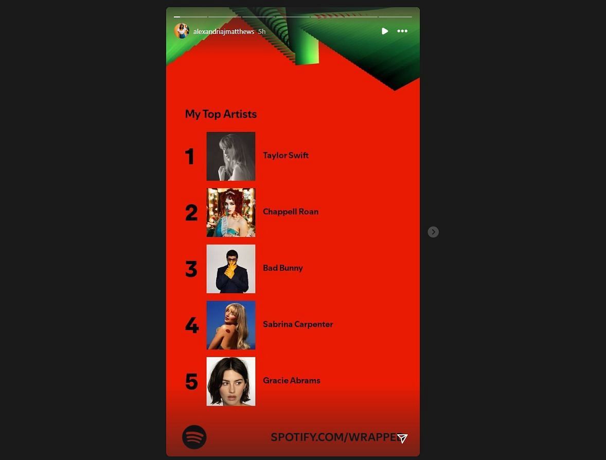 Auston Matthews' sister Alexandria Matthews shared her Spotify Wrapped highlights, revealing her top artists and songs for the year. Alexandria took to Instagram on Friday to show her music preferences, which included popular names like Taylor Swift and Sabrina Carpenter. She posted a story listing her top five artists, featuring Taylor Swift at the top, followed by Chappell Roan, Bad Bunny, Sabrina Carpenter and Gracie Abrams.