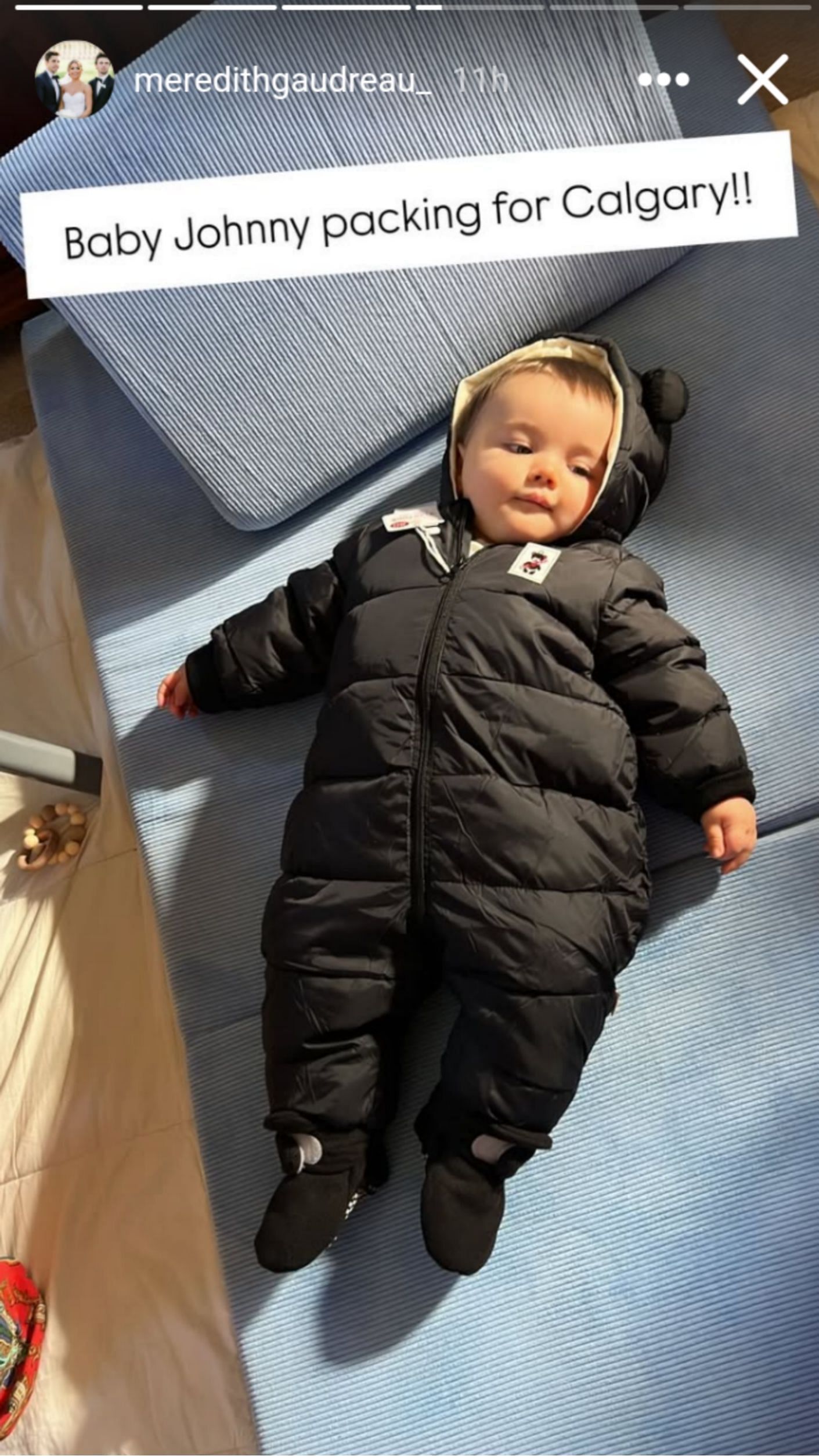 Johnny Gaudreau’s wife, Meredith, shared a few pictures on her Instagram stories from the family’s preparation before they traveled to Calgary. One of the pictures showed her youngest son, Baby Johnny, in a jacket as she wrote in the caption: