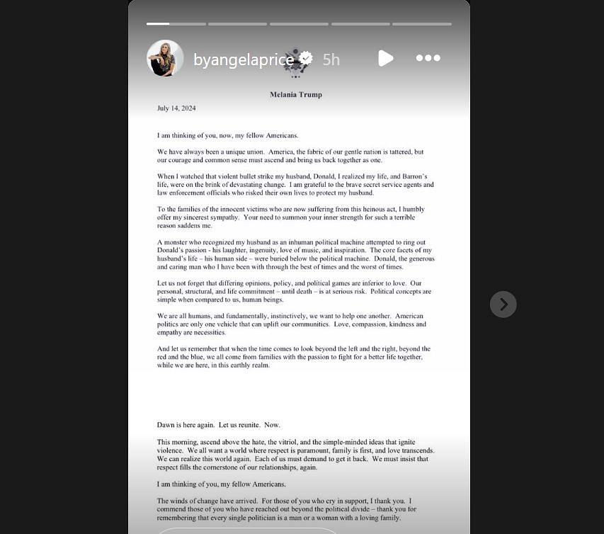 Angela shared a statement made by Melania Trump on her Instagram story, praising the former First Lady's words, commenting, "Wow, beautifully said." She then posted a video sharing her thoughts on the situation.
