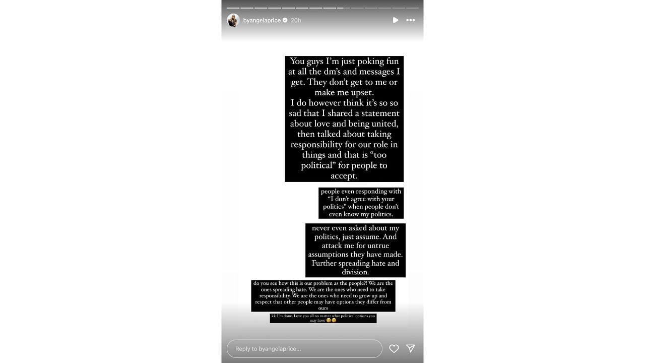 "They don't get to me or make me upset. I do however think it's sad that I shared a statement about love being united, then talked about taking responsibility for our role in things and that is 'too political' for some people to accept."