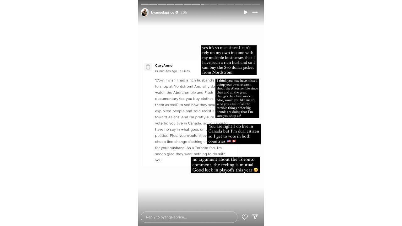 Sharing on her Instagram story, one person commented that she needs to research where she buys her clothes and intimated that Canadians (where Price currently lives) should stay out of American politics.
