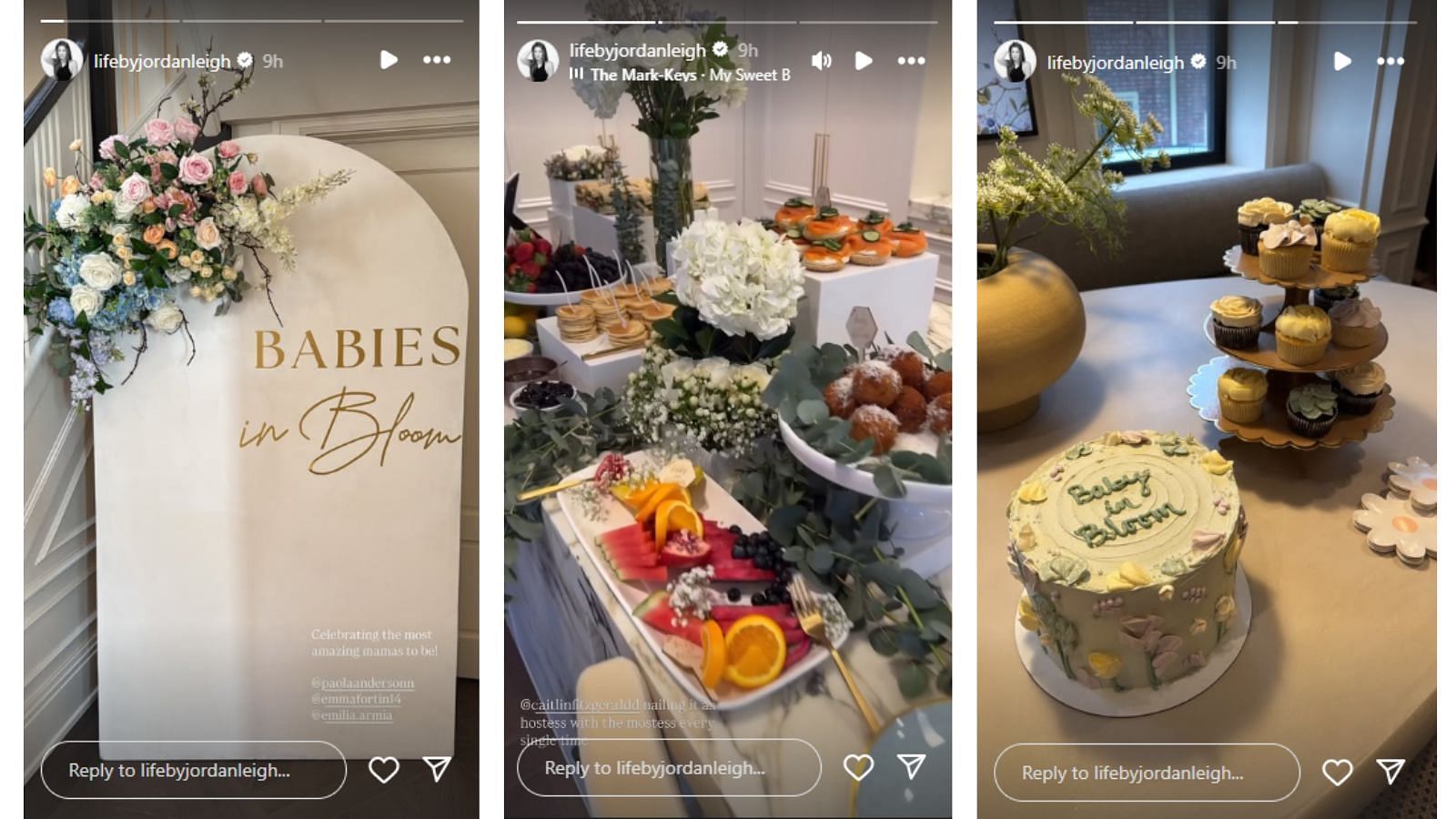 Jordan Leigh shared a series of pictures and clips of the celebration on her Instagram stories. One photo showed a stunning white arched backdrop with the words “BABIES in Bloom” written in gold.