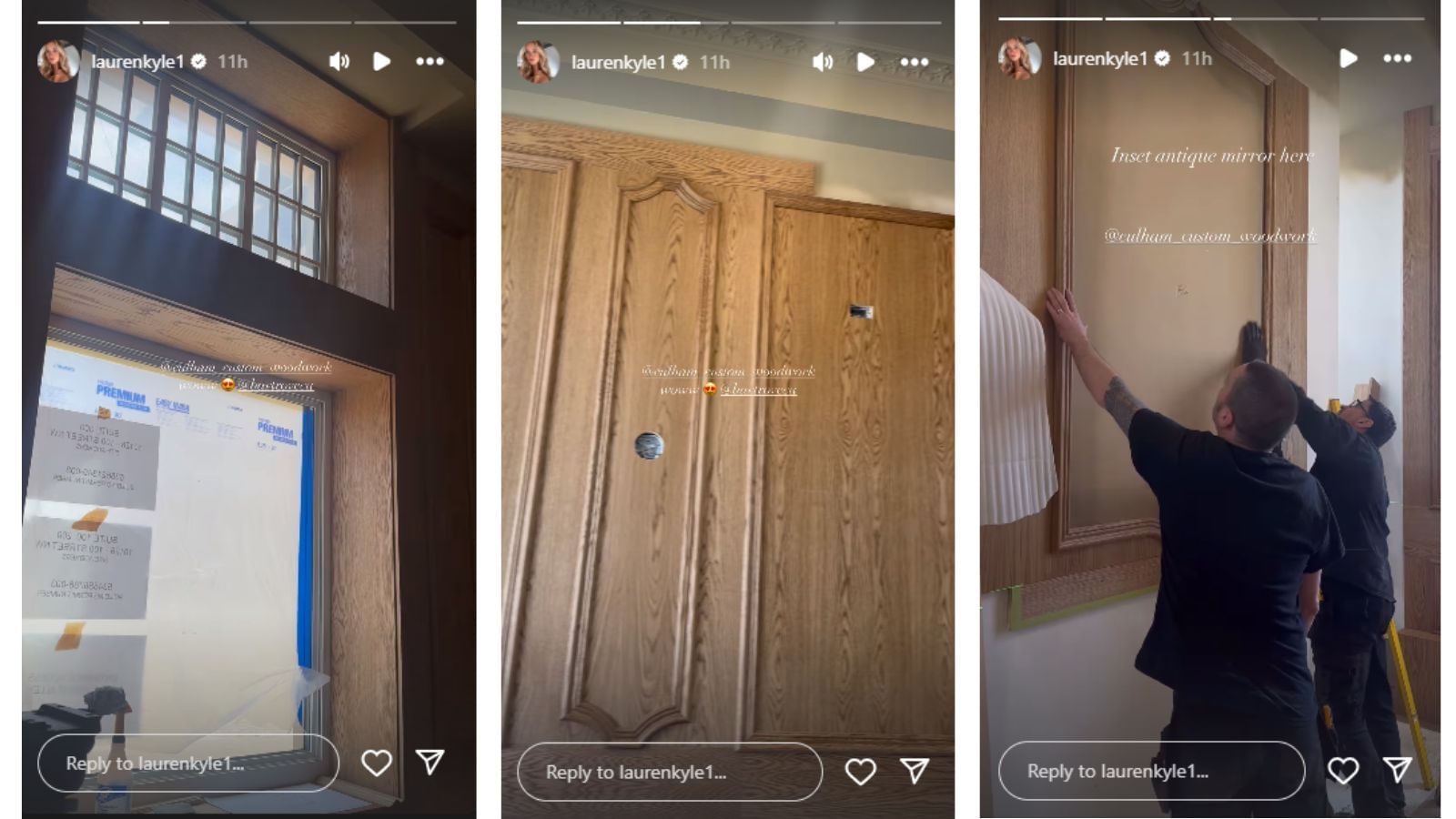 Last week, she also posted Instagram stories showing construction progress. One of the photos showed a warm-toned ceiling with molding details. Another showed a floral-patterned tile in white, beige and black colors. A third story showed a half-painted room with construction materials.