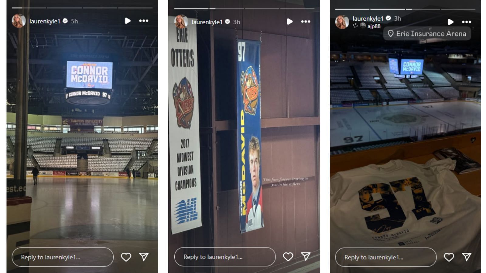 The Otters players took to the ice wearing McDavid-themed jerseys during warm-ups on the night to celebrate the former OHL star. His No. 97 jersey was officially raised to the rafters and Lauren wrote caption for one story featuring Connor McDavid’s #97 banner in the arena.