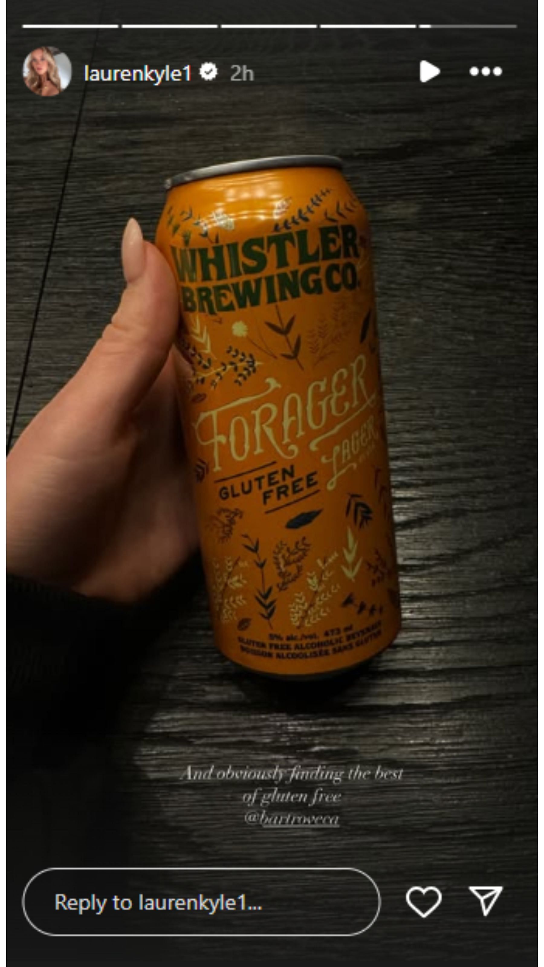 In the next story, Kyle posted a picture of the Whistler Brewing Co. Forager Gluten Free Lager, usually available at $16.49 for a six-pack.