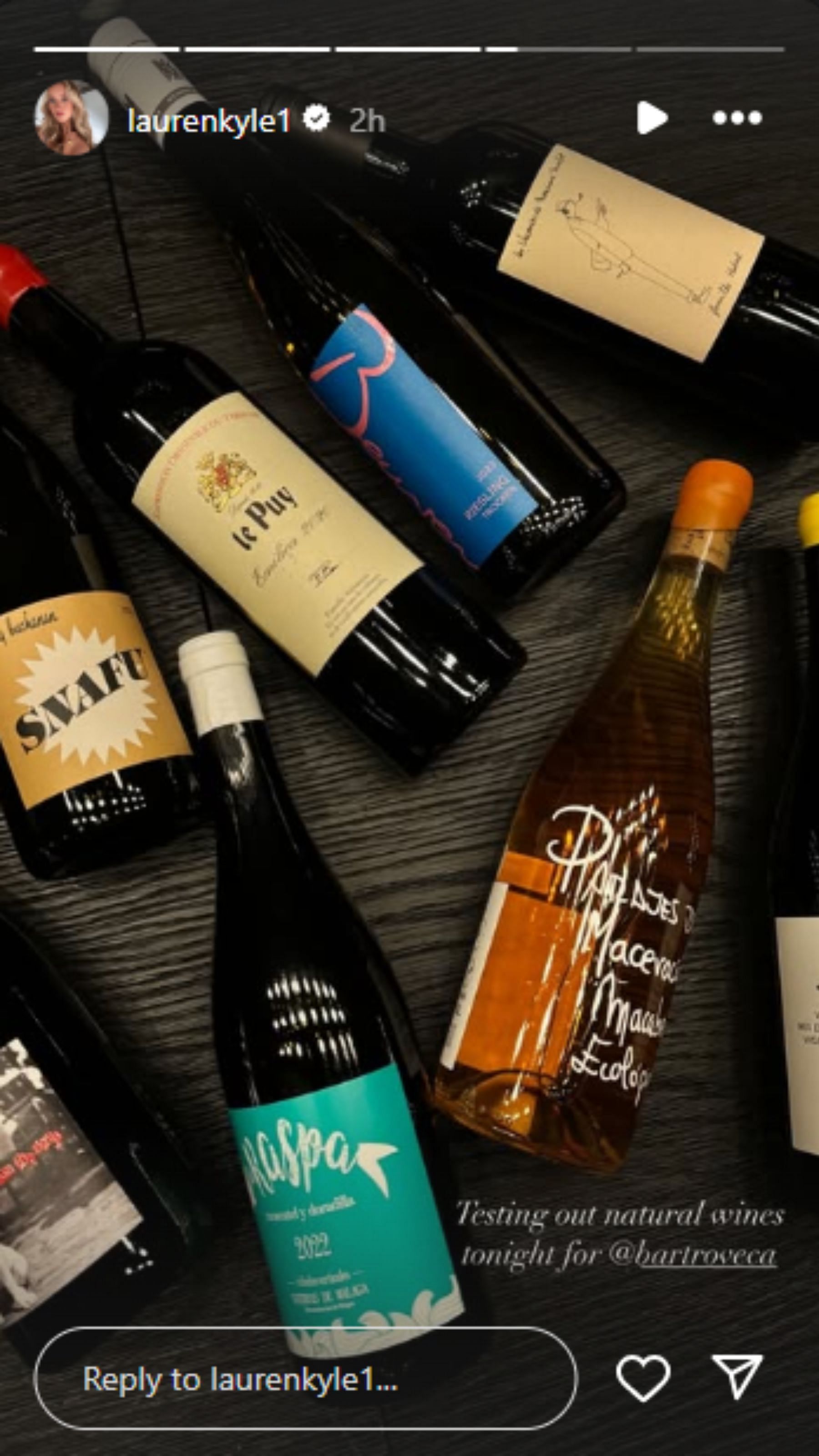 “Testing out natural wines tonight for @bartroveca,” Lauren Kyle captioned the story.