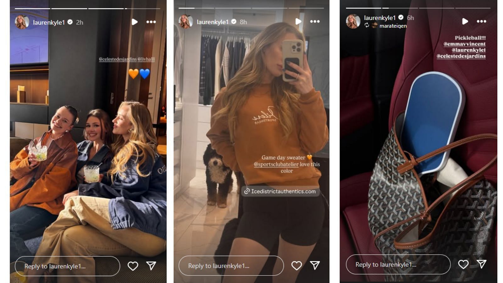 There was another story featuring a Goyard tote bag resting on the red seat of a car, packed with a pickleball paddle. The picture was originally posted by Oilers forward Evander Kane’s fiancée, Mara Teigen, which Lauren reposted on her stories. Celeste Desjardins was also tagged in the story.