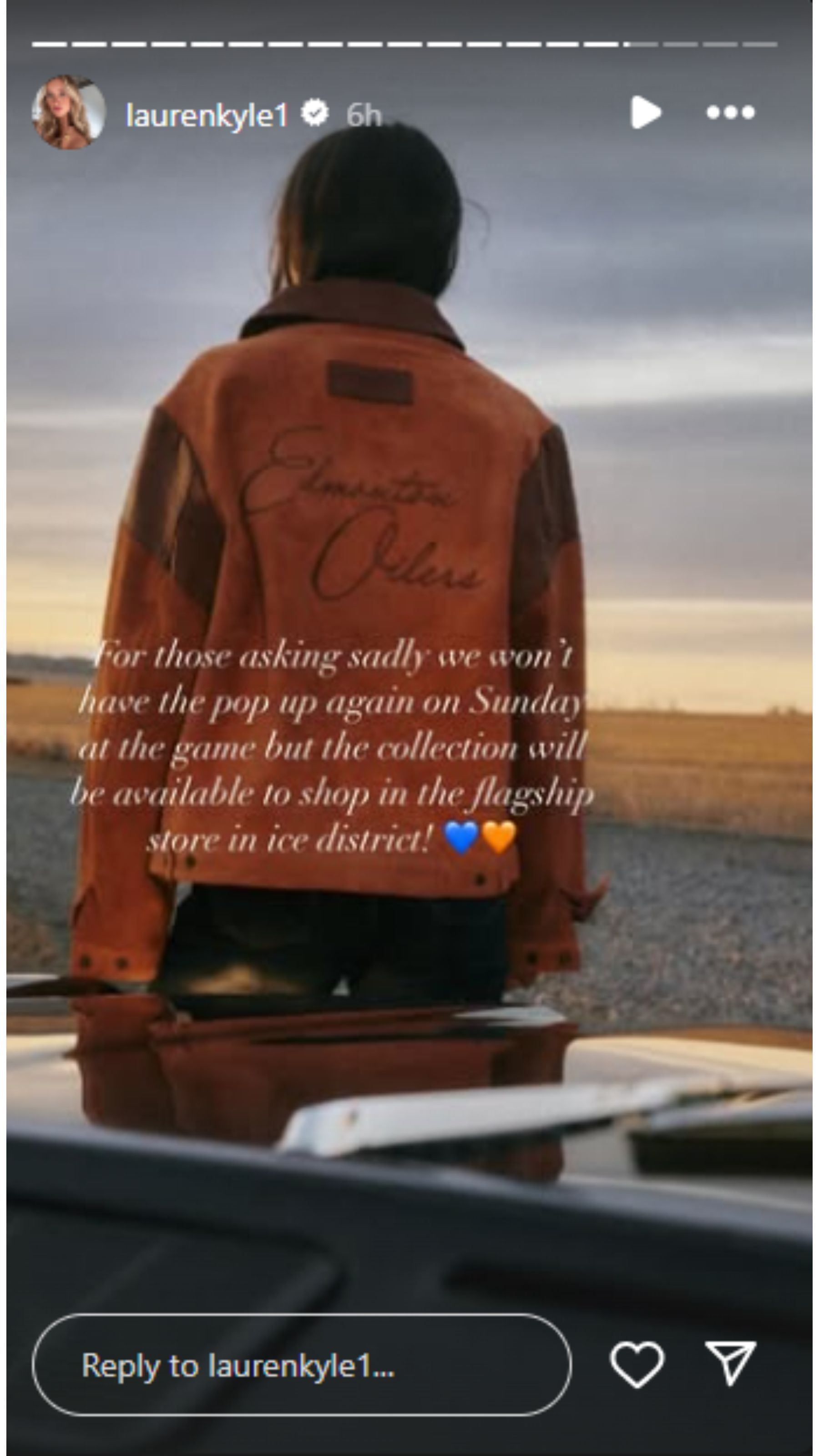 On Saturday, Lauren shared an important update regarding the next event on her Instagram stories. She mentioned that the pop-up won't be available again on Sunday during Game 4 at Rogers Place.