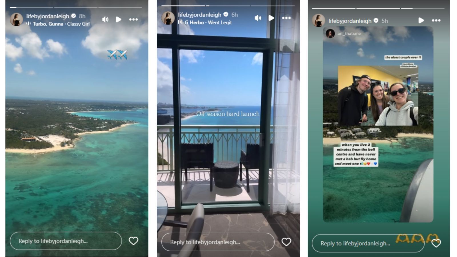 One of the stories showed an aerial view of turquoise waters and sandy beaches in the Bahamas, taken from the plane. Another showed the oceanfront balcony view from their hotel room as Jordan opened the sliding door and stepped onto the balcony.