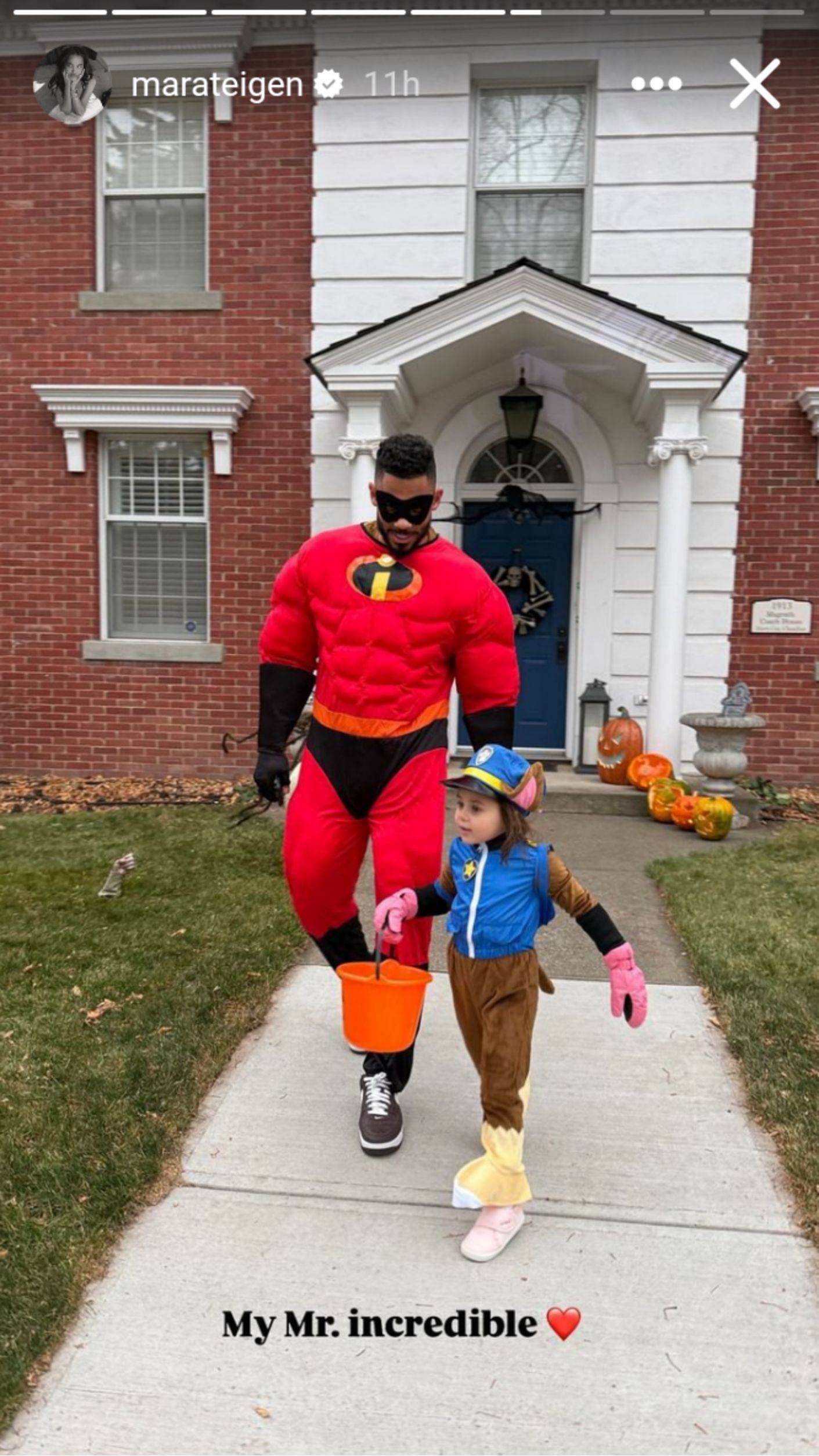 In the final story, Kane joined the family fun, donning a red and black Mr. Incredible costume, complete with a mask, while he and Kensington headed out for trick-or-treating. Kensington was holding a bright orange candy bucket as they walked down the sidewalk together. Teigen captioned the picture, writing: