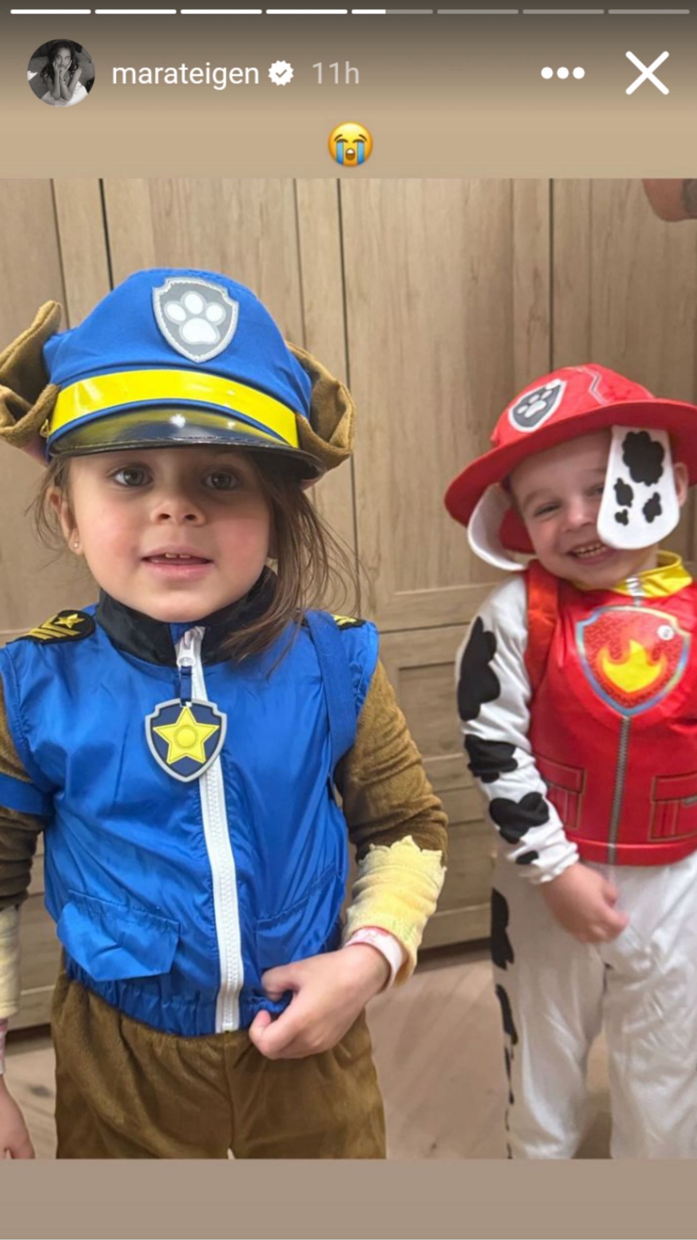 The next picture featured Kane’s daughter Kensington dressed as Chase from Paw Patrol. Her outfit included a blue jacket with a yellow stripe, brown pants and a blue hat with dog ears. Kane’s oldest son Iverson dressed as Marshall, another Paw Patrol character, wearing a red jacket with a flame logo, white pants with Dalmatian spots and a red hat with dog ears.