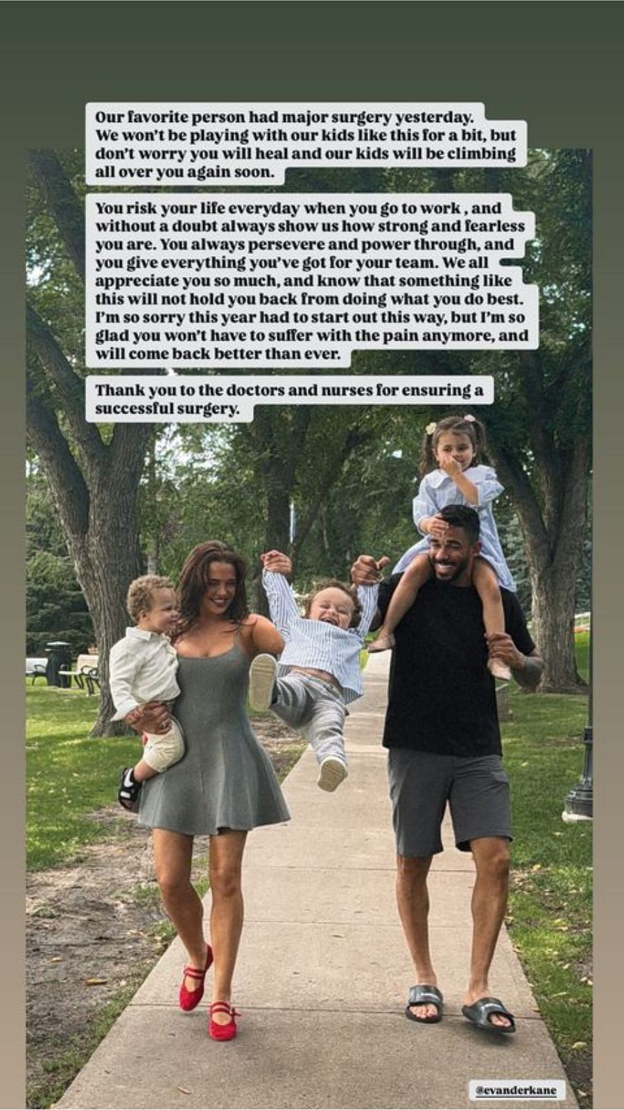 After the surgery, Kane’s partner, Mara Teigen, took to her Instagram story to pen an emotional message for him. She posted a picture of their family of five and wrote: