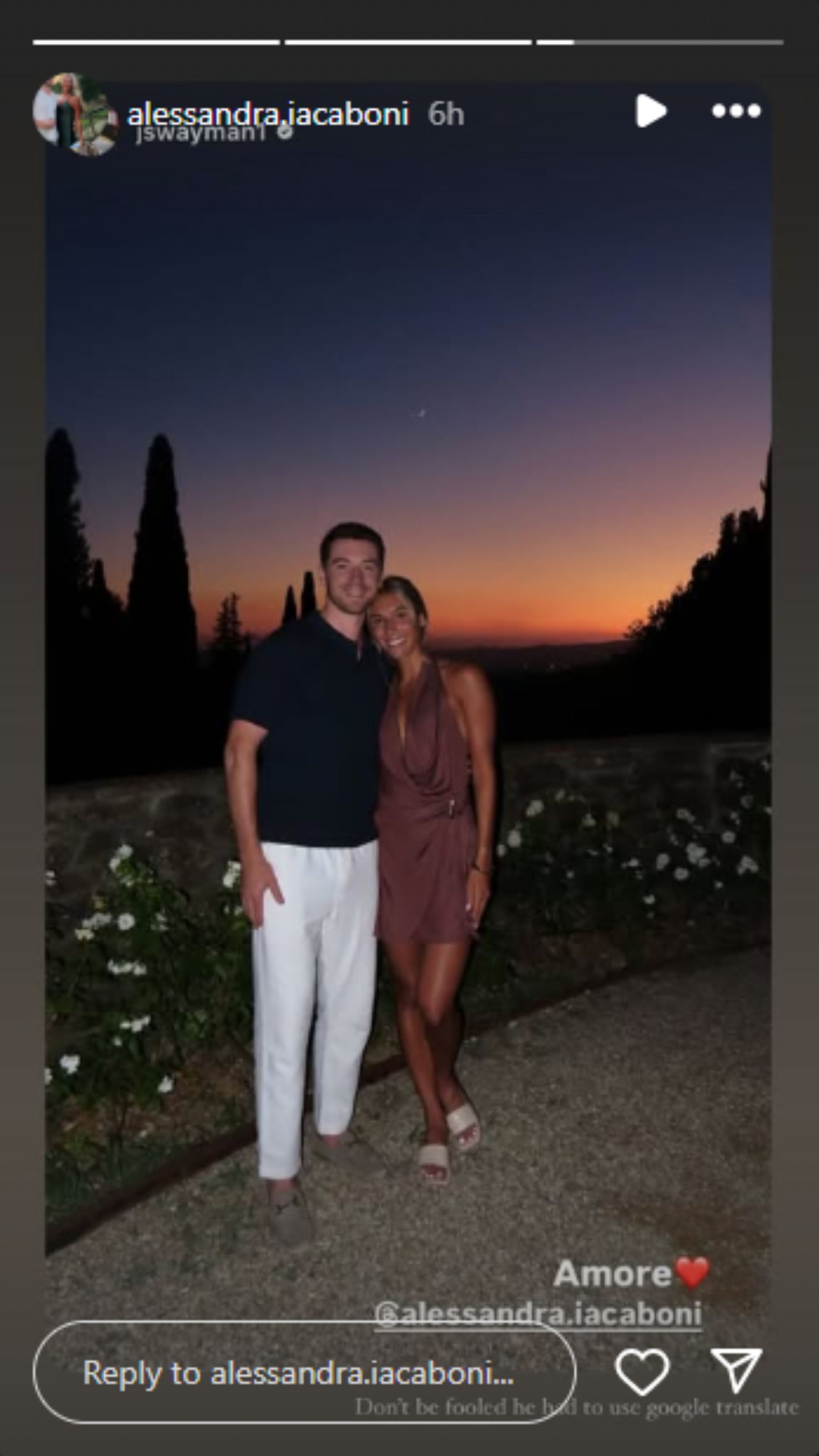This week, Boston Bruins goaltender Jeremy Swayman shared a lovely couple click with his girlfriend Alessandra Iacaboni on her Instagram stories with an Italia caption. Alessandra later reposted the story on her own account with a teasing remark on Wednesday.