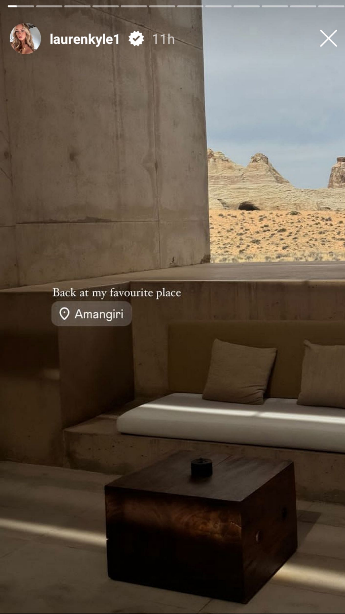 On Sunday, Lauren Kyle posted a series of pictures on her Instagram stories. She shared a snap of an outdoor lounge area featuring earth-toned furniture and a small wooden coffee table, overlooking the desert landscape of Amangiri.