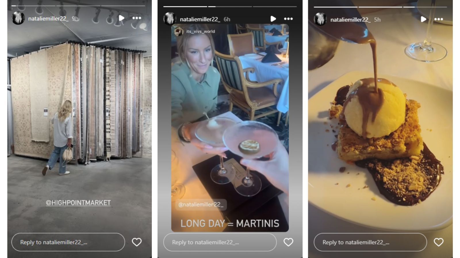 One of the clicks showed Natalie browsing through a large display of hanging rugs. The High Point Market is one of the world’s largest home furnishings trade shows. It is held twice a year and attracts tens of thousands of designers, buyers and industry professionals from all over the world.