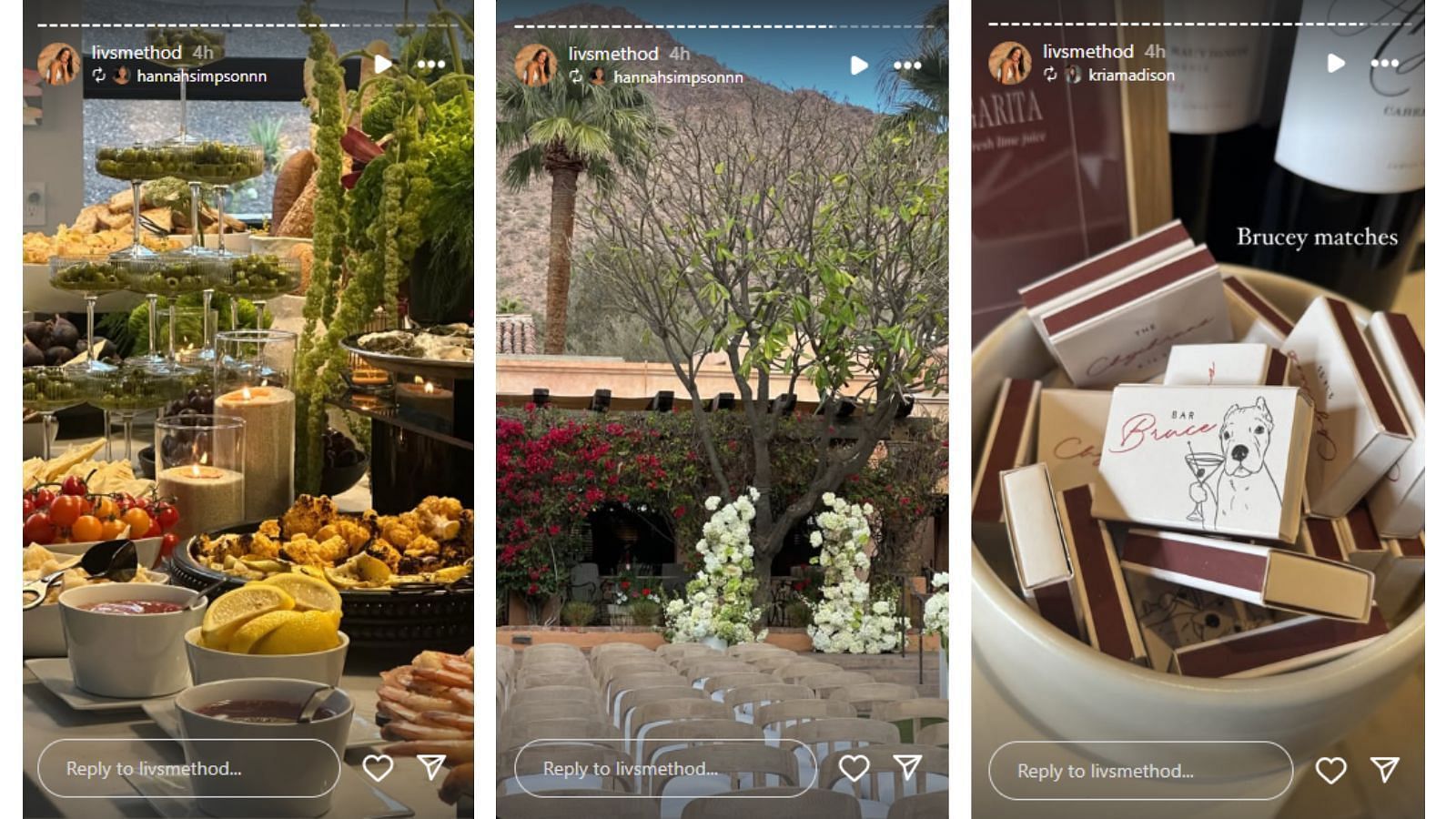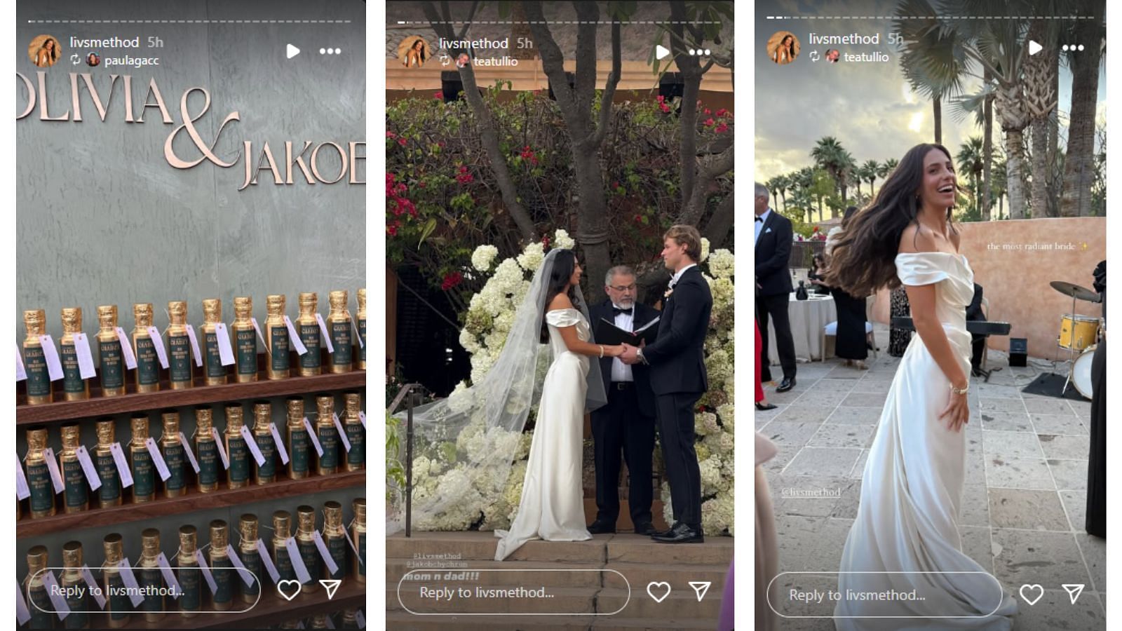 A third story showed Olivia in her wedding dress, smiling radiantly as she twirled. The outdoor reception area was visible in the background, featuring palm trees, a live band setup and wedding guests in formal attire.