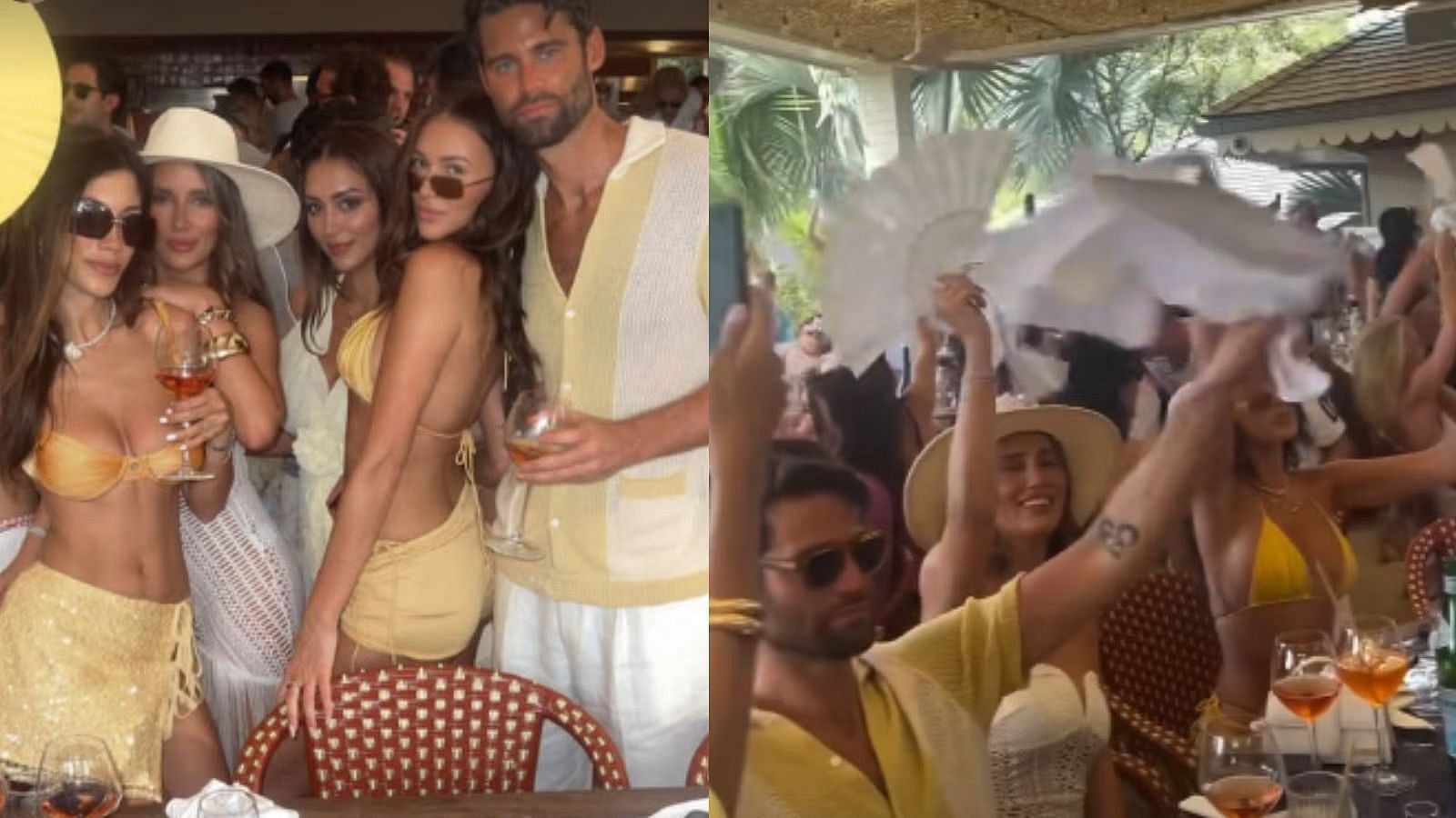 Another picture showed a yellow beaded handbag placed on a table with flowers in the background. There was also a yellow folding fan with “Paulina” engraved on it resting on a white plate labeled “La Guérite.” She also shared photos of her and her friends dressed in yellow and white outfits at the resort. One of the stories showed guests at the beach waving white fans and celebrating.