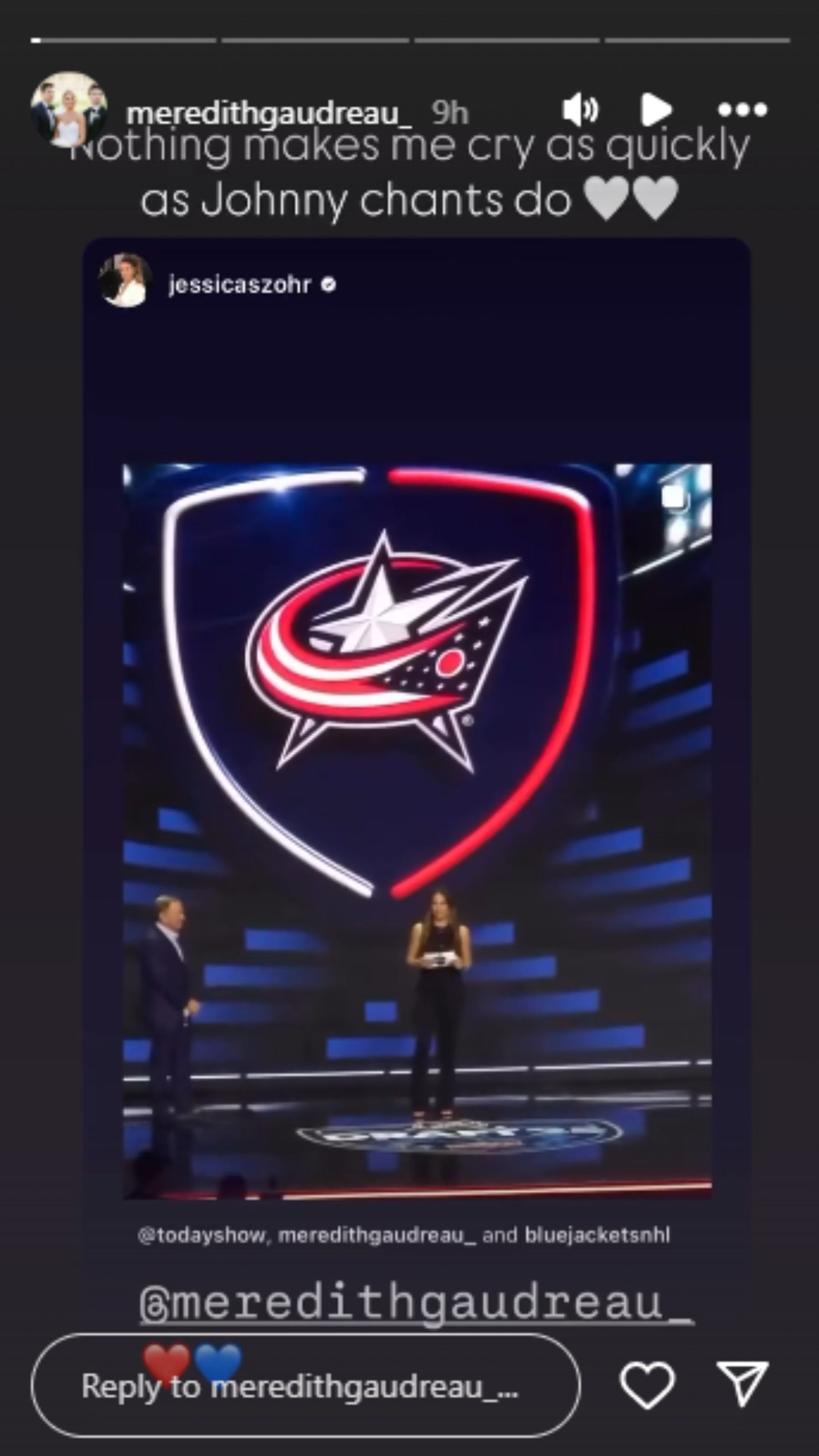 After the draft, Meredith reposted a video on Instagram that was originally shared by ex-NHLer Brad Richardson’s wife Jessica Szohr. The story featured the special moment of Meredith’s entrance on stage and the crowd’s reaction. Jessica also tagged Meredith on the story.