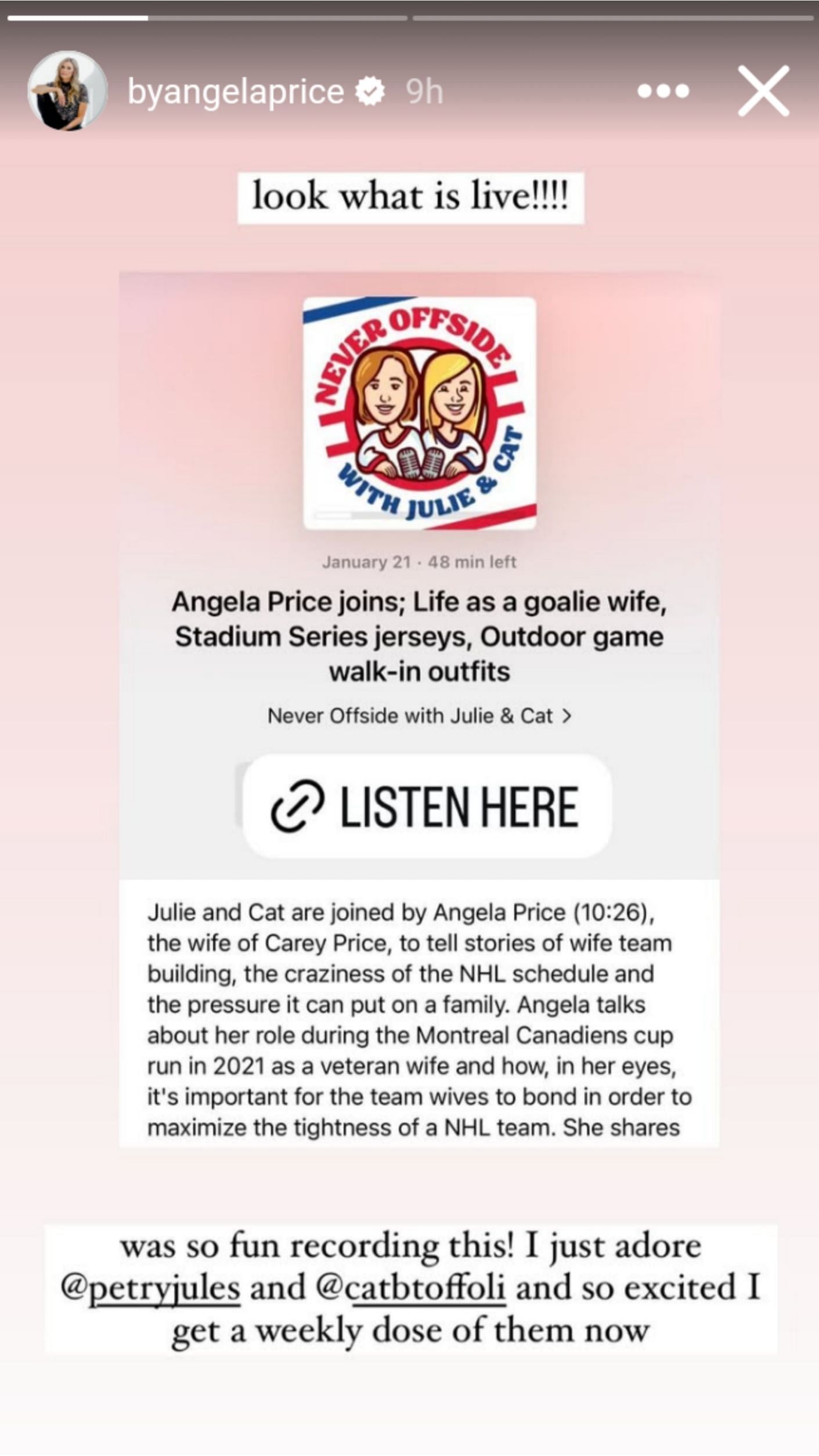 Angela Price made a guest appearance in the second episode of NHL’s Never Offside Podcast hosted by Tyler Toffoli’s wife Cat and Jeff Petry’s wife Julie. The episode aired on Jan. 21.