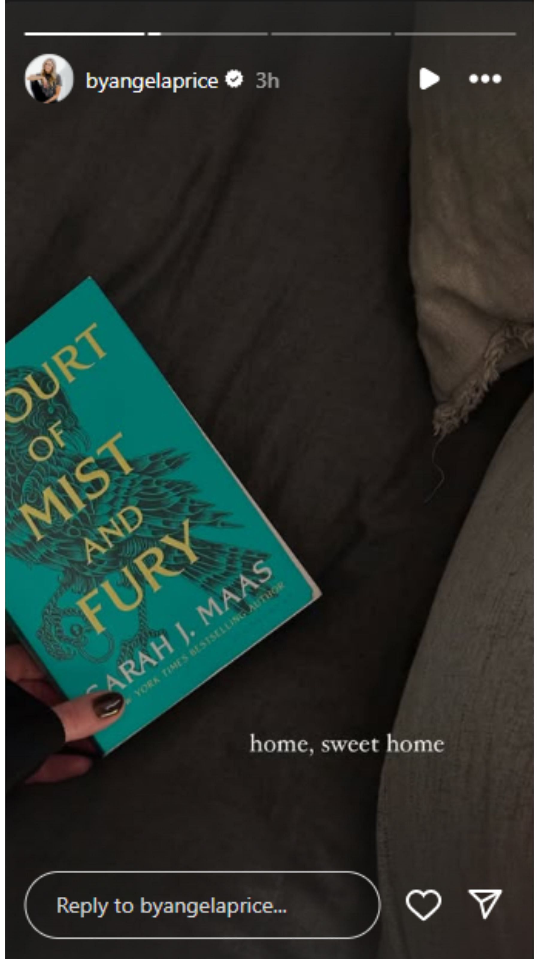 Feyre and Rhysand are the protagonists of the bestselling book series, “A Court of Thorns and Roses”. Angela is reading the second book of the series, which is widely regarded as one the most popular titles in the Romantasy genre.