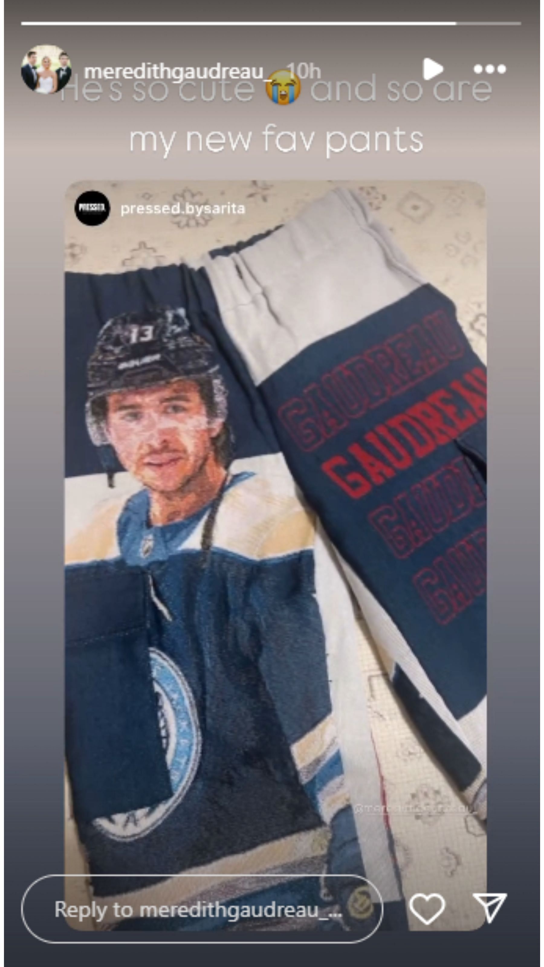 On Friday, Johnny Gaudreau’s wife, Meredith, shared a clip from the Instagram account of 'Pressed by Sarita,' which is a custom gameday apparel manufacturer, on her stories. The clip featured a close up look at custom-made Johnny Gaudreau pants made by the fashion label.