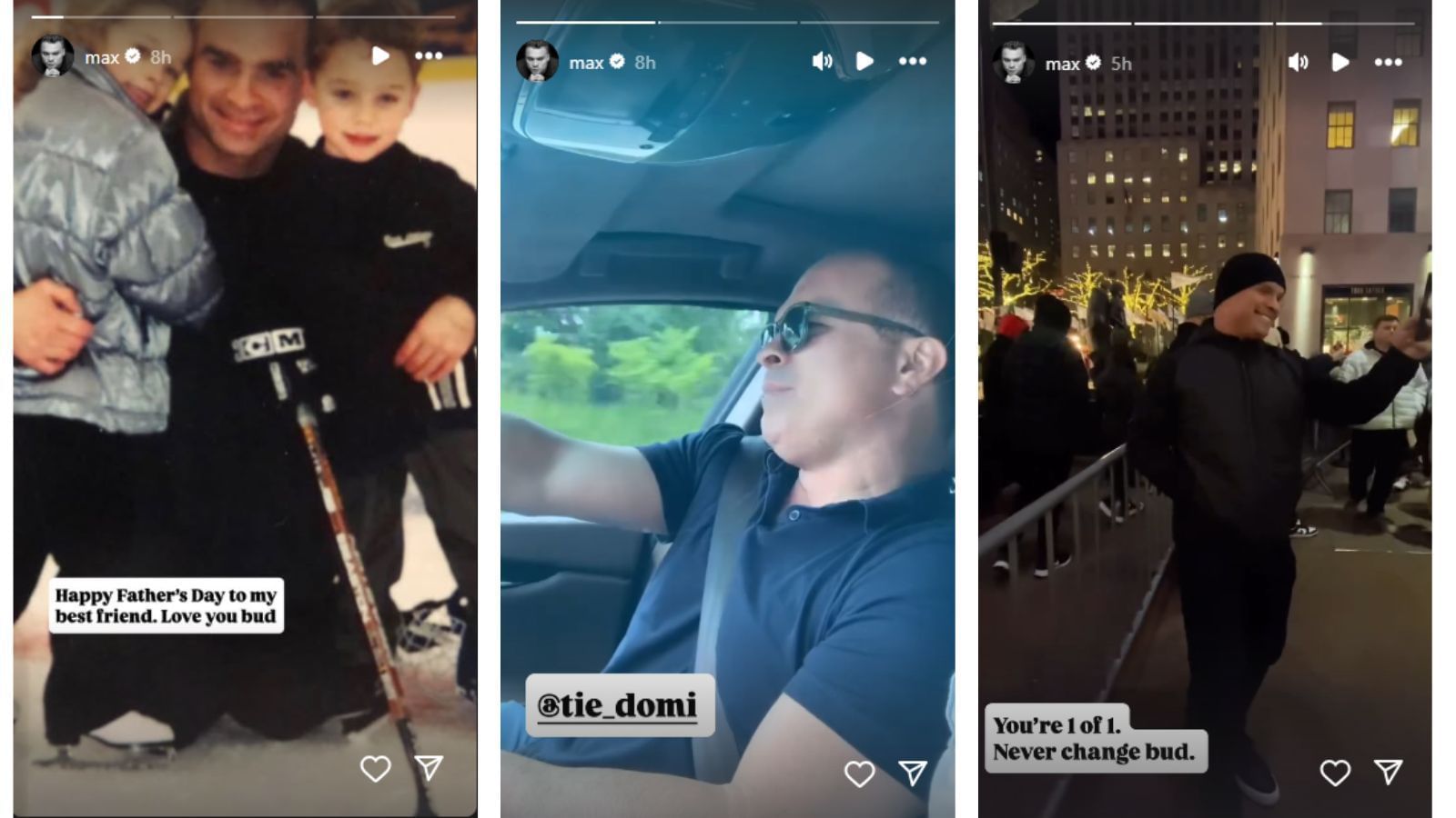 Another story featured a video of Tie Domi driving a car while vibing to music, wearing sunglasses and a black polo shirt. Max tagged his dad’s handle, @tie_domi, in the clip.