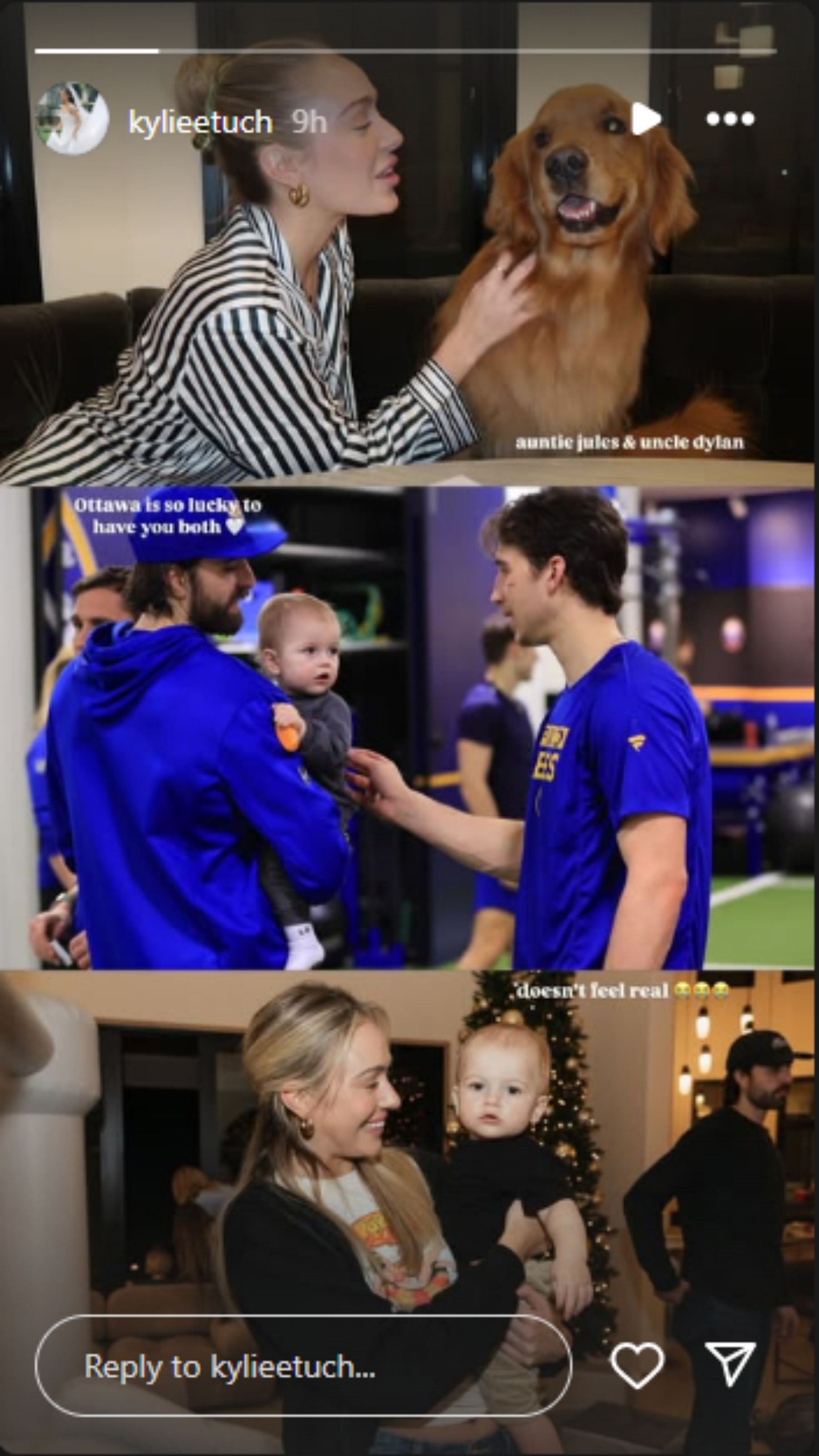 The first picture saw Jules petting the Tuchs’ golden retriever while the next photo featured Dylan Cozens sharing a sweet moment with Alex Tuch’s son Tripp who was in his father’s arms.