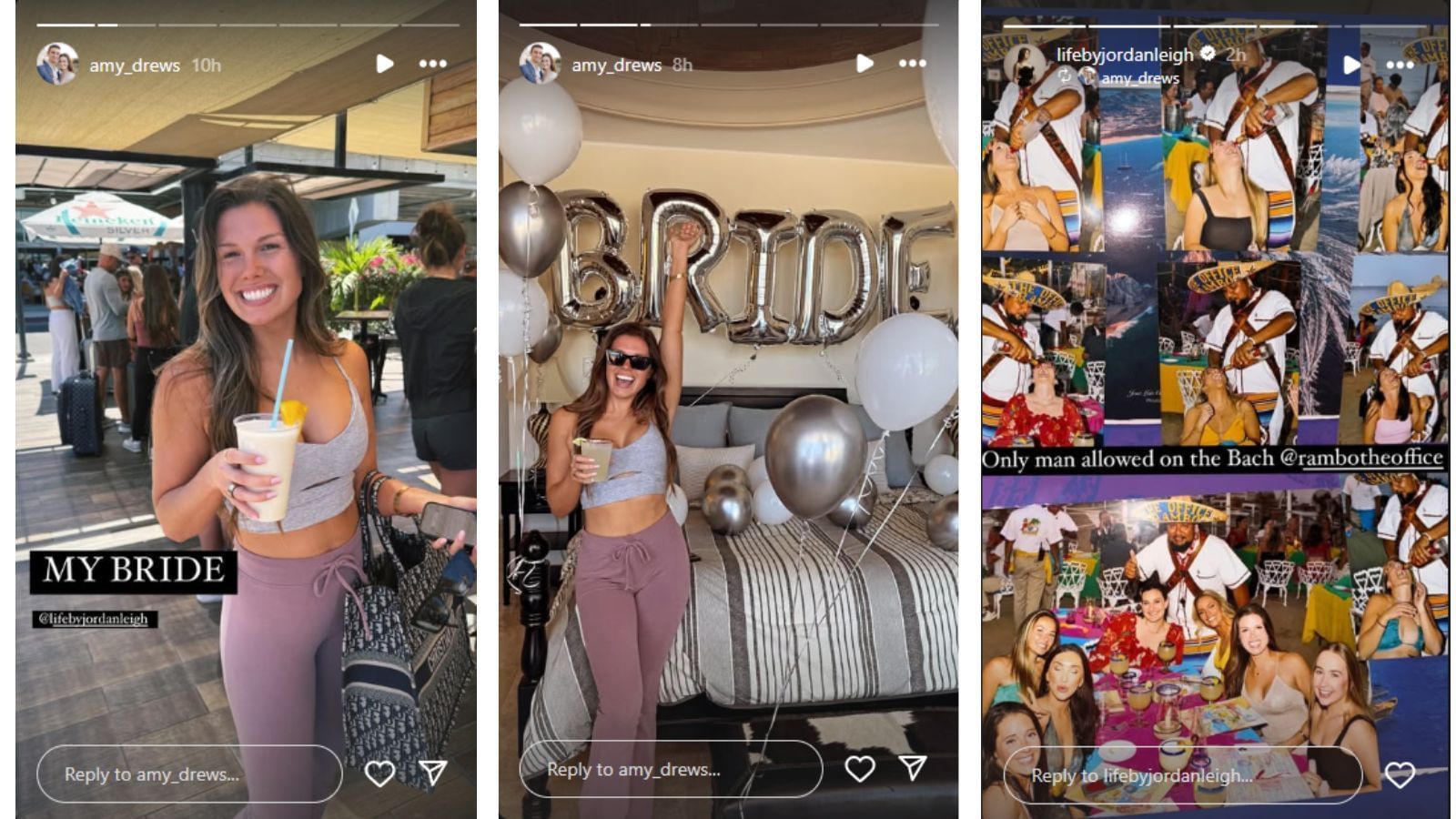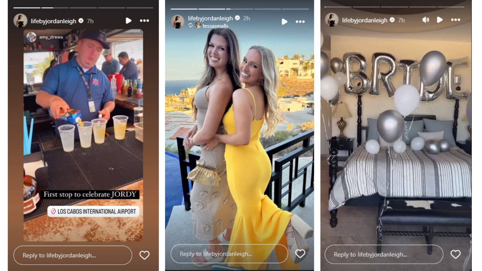 Jordan also shared a short clip featuring her room decked out with silver and white balloons, and giant letters spelling “BRIDE” over the bed. More stories from her friends showed custom party treats made of coconuts decorated with purple flowers. Each coconut had the words "Jordan’s Bachelorette, Cabo San Lucas, 2025" written on it.