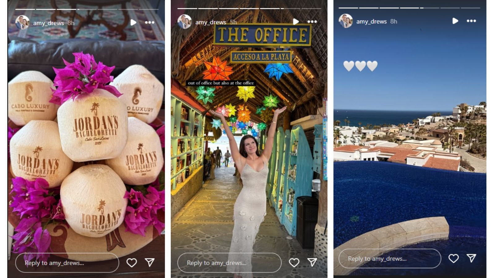 One of the stories showed a bartender at the Los Cabos International Airport pouring drinks at a bar. The next click saw Jordan beaming on a sunny balcony overlooking the Cabo ocean with her friend Tessa.