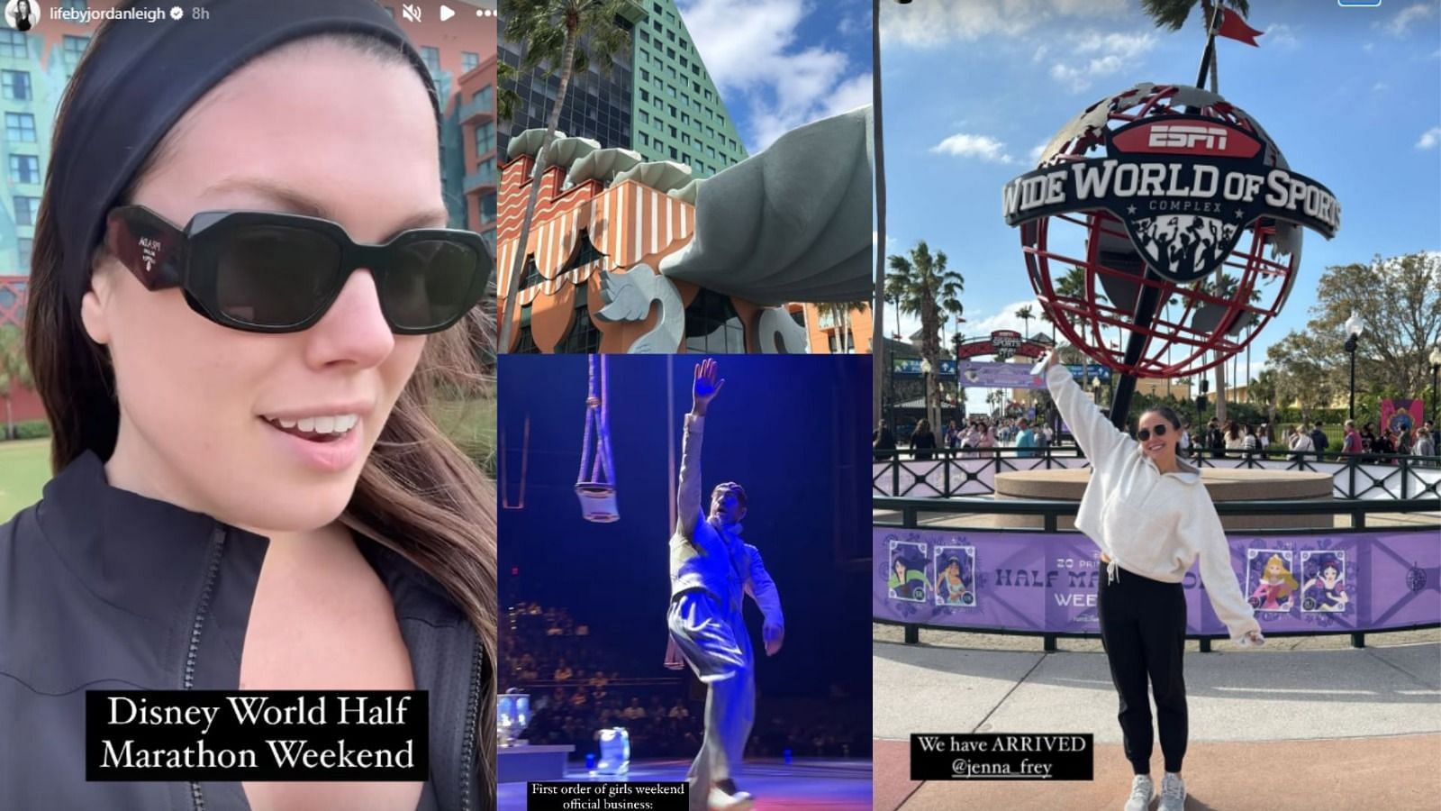 Jordan Leigh posted a photo of a Disney resort hotel with a colorful design. She later shared a picture of herself at the ESPN Wide World of Sports Complex globe, tagged a friend and showed her excitement for the marathon.