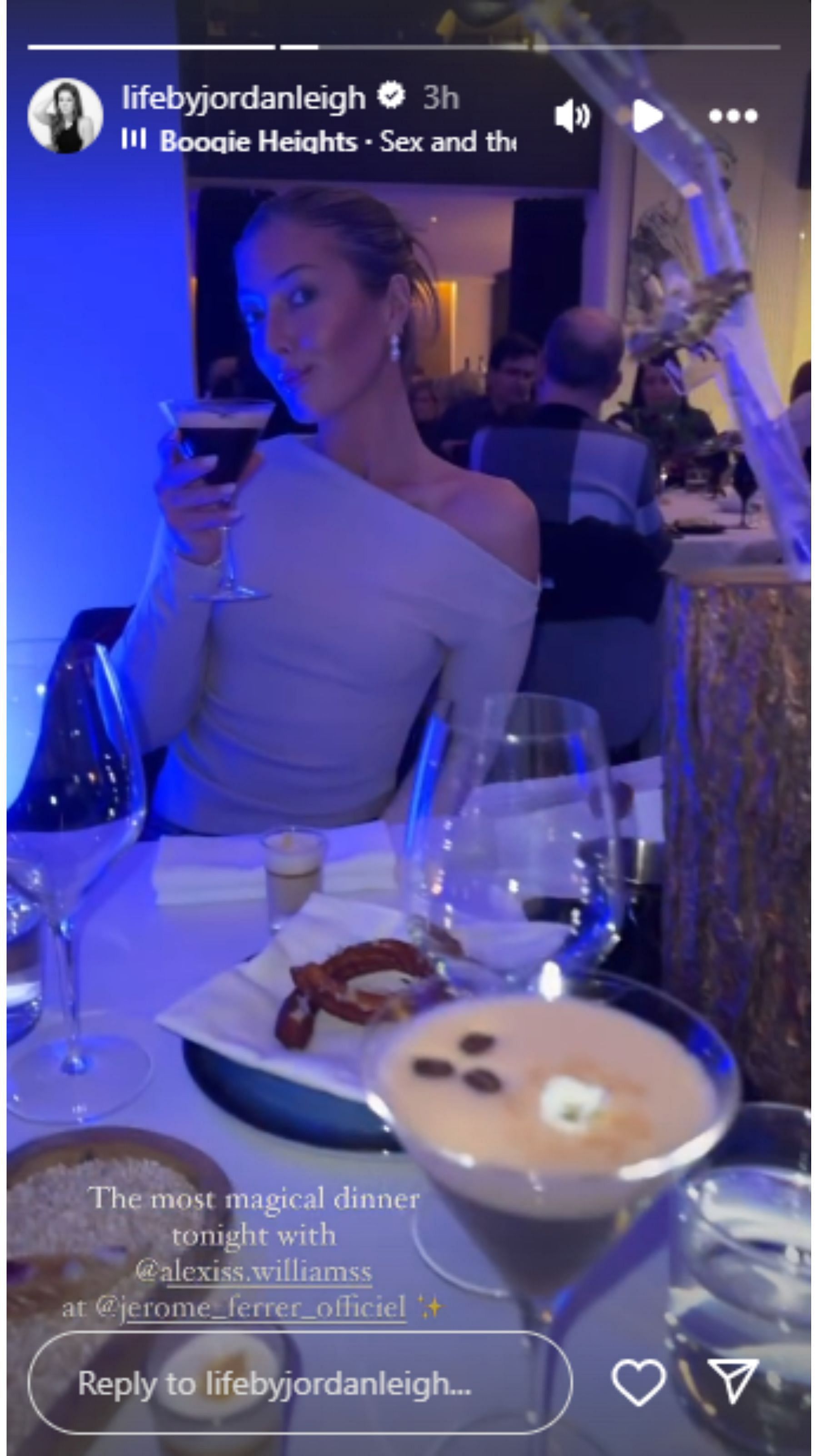 “The most magical dinner tonight with @alexiss.williamss at @jerome_ferrer_officiel ✨”, Leigh captioned the story.