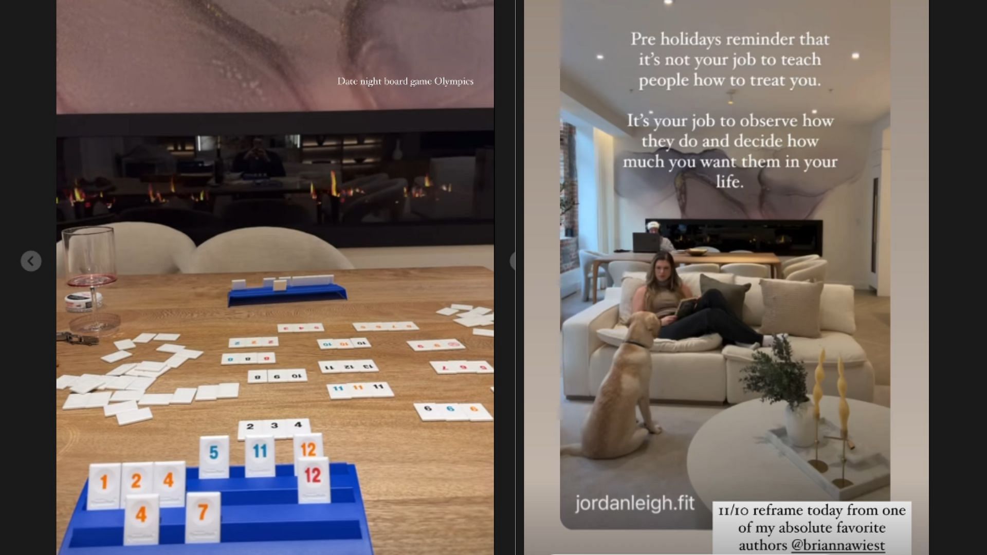 Leigh shared another story hours later. Jordan sat on a white couch reading a book while their dog looked up at her. The room had a simple and modern look, with neutral tones and decorative candles on the coffee table.