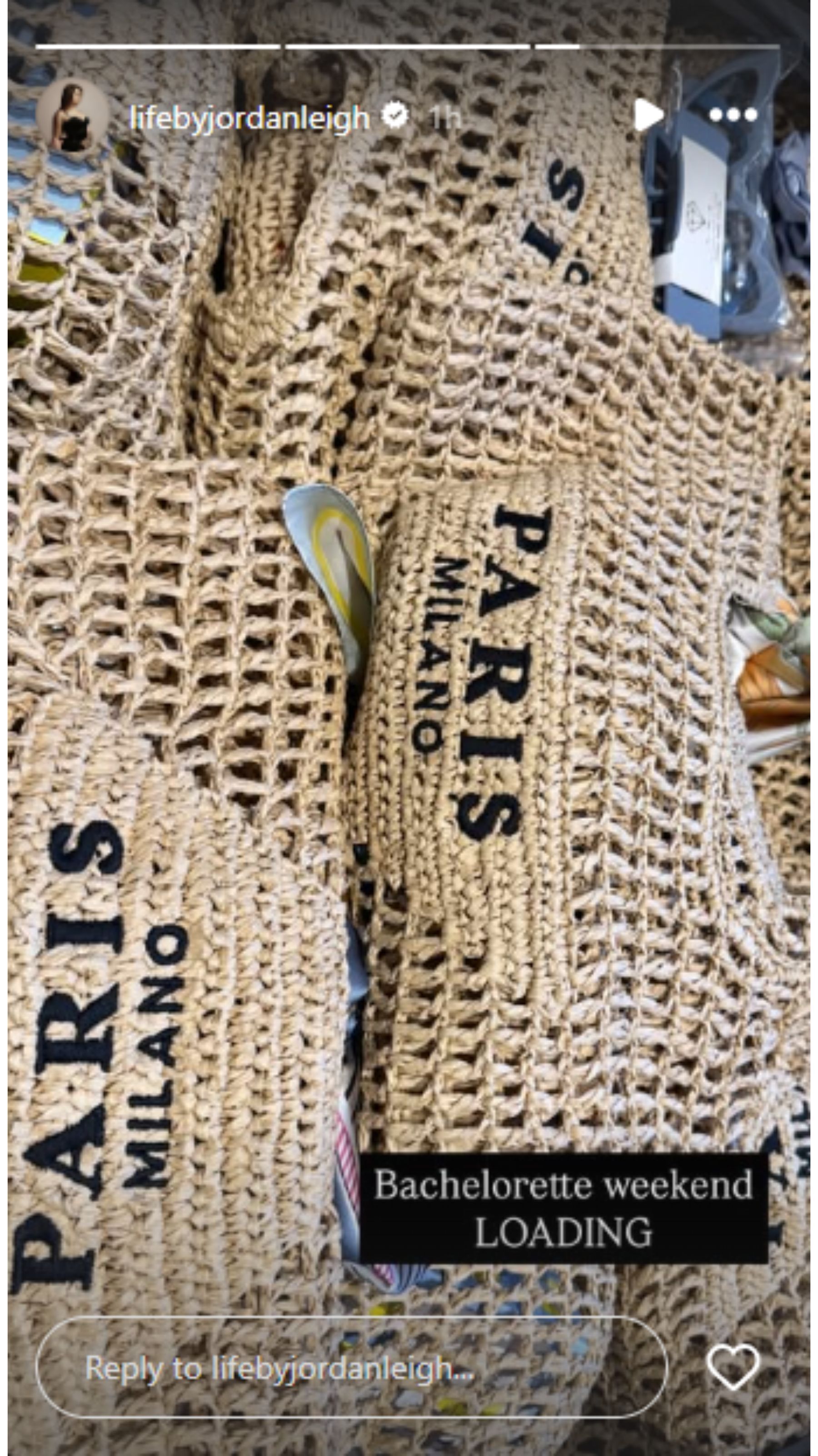 Jordan Lerigh posted a photo featuring several woven “PARIS MILANO” tote bags on her Instagram stories.. The caption on the image read: