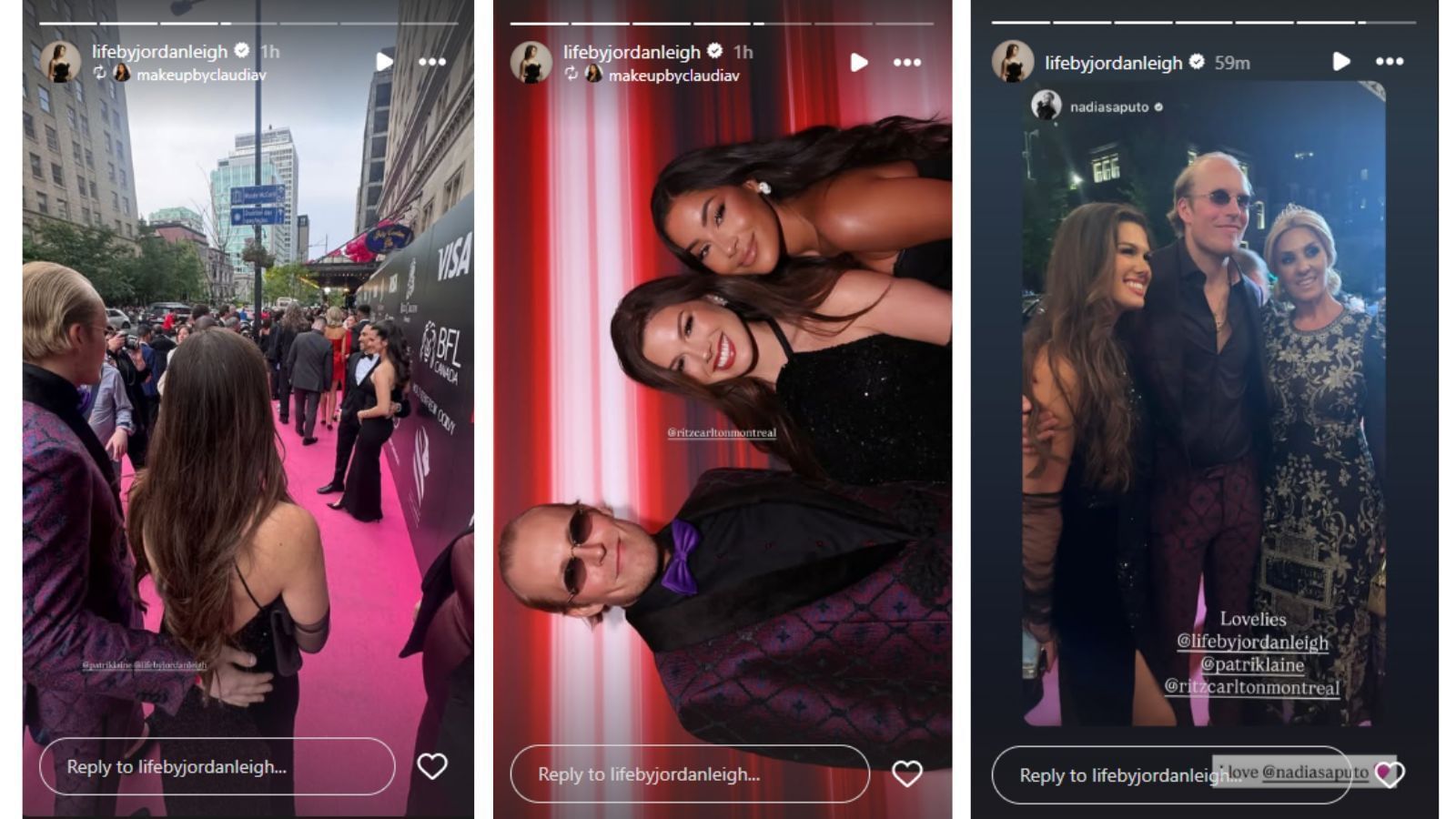 On Friday, Laine and Leigh attended the Ritz Royale Gala at The Ritz-Carlton in Montreal. The black-tie event included fine food, champagne, live performances and luxury brand displays. Jordan wore a black gown and Laine wore a violet-patterned suit jacket on the occasion.