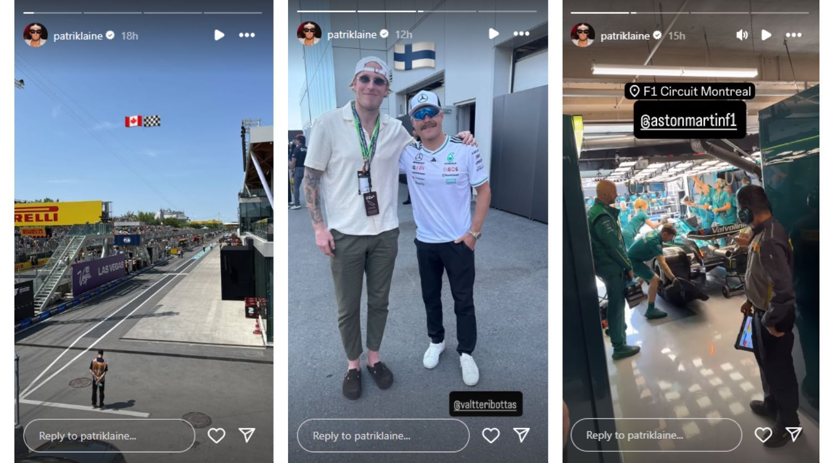Patrik Laine shared a series of stories from his race day experience on Instagram. One of the clicks featured the Circuit Gilles Villeneuve with the Canadian and checkered flags flying above the main straight.