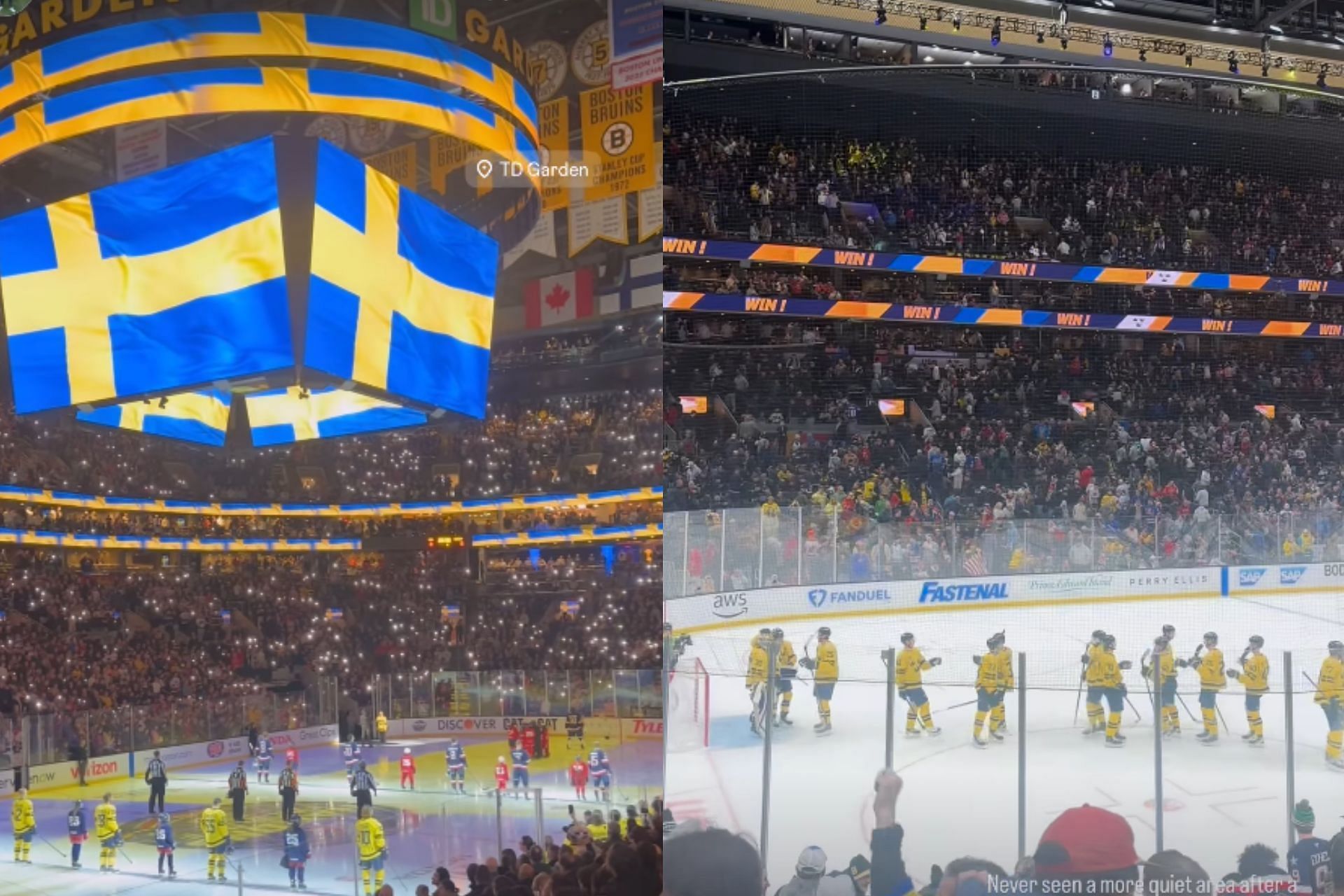 In the first video, the Swedish flag appeared on the arena’s large screen as fans waved their phone flashlights. Both teams stood on the ice before the game, and the atmosphere looked lively.