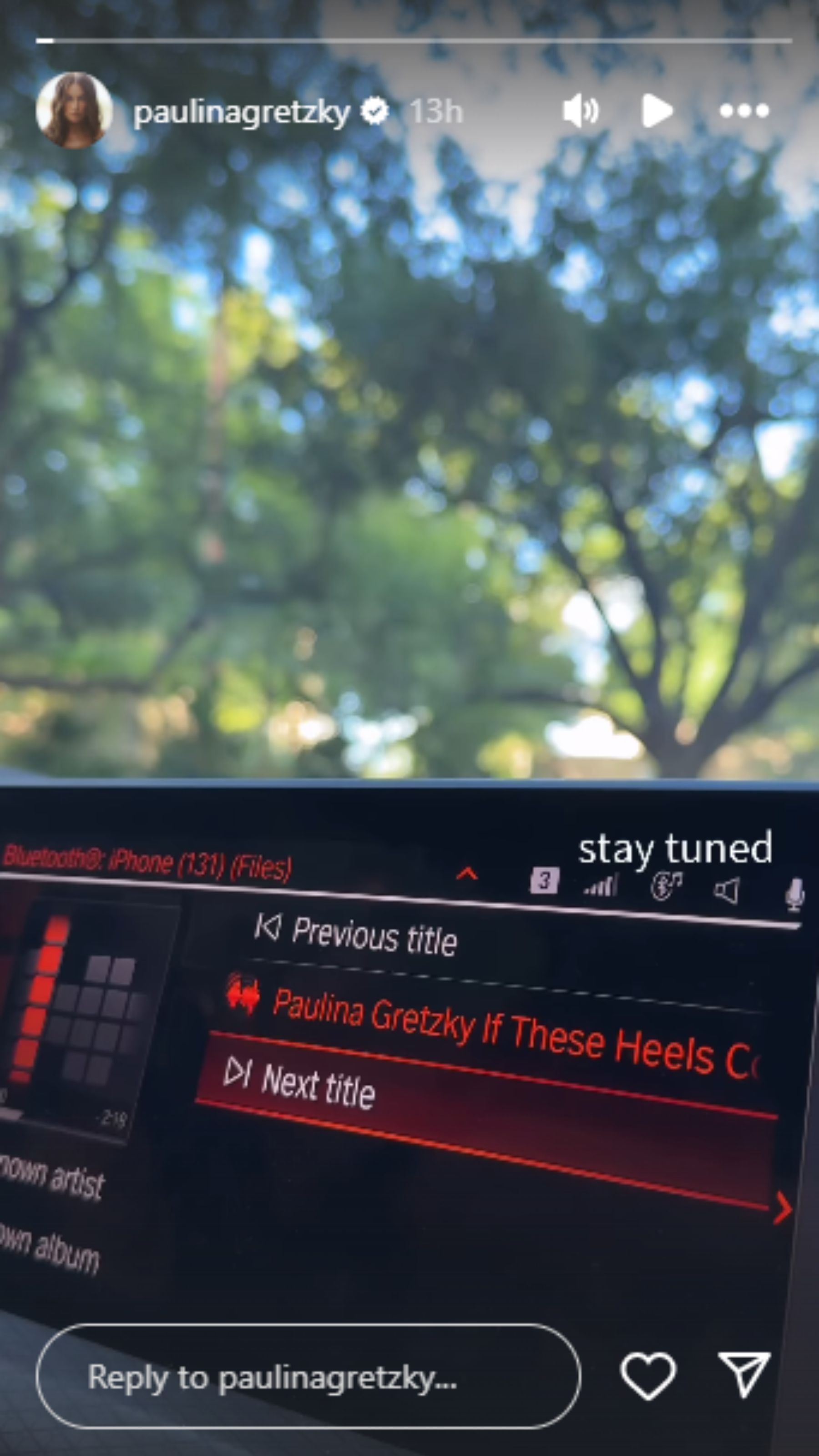 In the photo, she snapped a shot from inside her car showing her vehicle’s infotainment screen connected via Bluetooth to an iPhone. Displayed on the screen was a track titled “If These Heels Co…” credited to Paulina Gretzky herself.