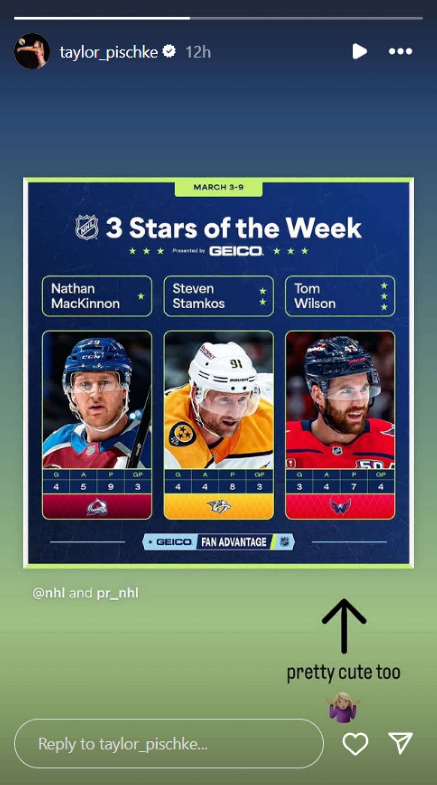 Washington Capitals right wing Tom Wilson was named one of the NHL's Three Stars of the Week after a strong offensive performance over four games. His wife, Taylor Pischke, reacted to the news in a simple but sweet way on her Instagram story.