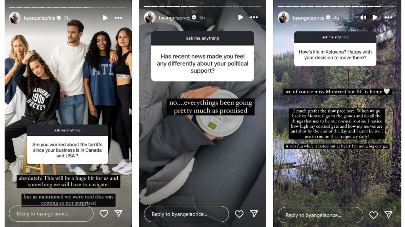 Habs legend Carey Price’s wife Angela did an Instagram Q&A session with her followers on Saturday. While addressing one of the questions, Angela touched on the matter of the U.S. imposing tariffs on imported goods from Canada and how it could affect her apparel businesses.
