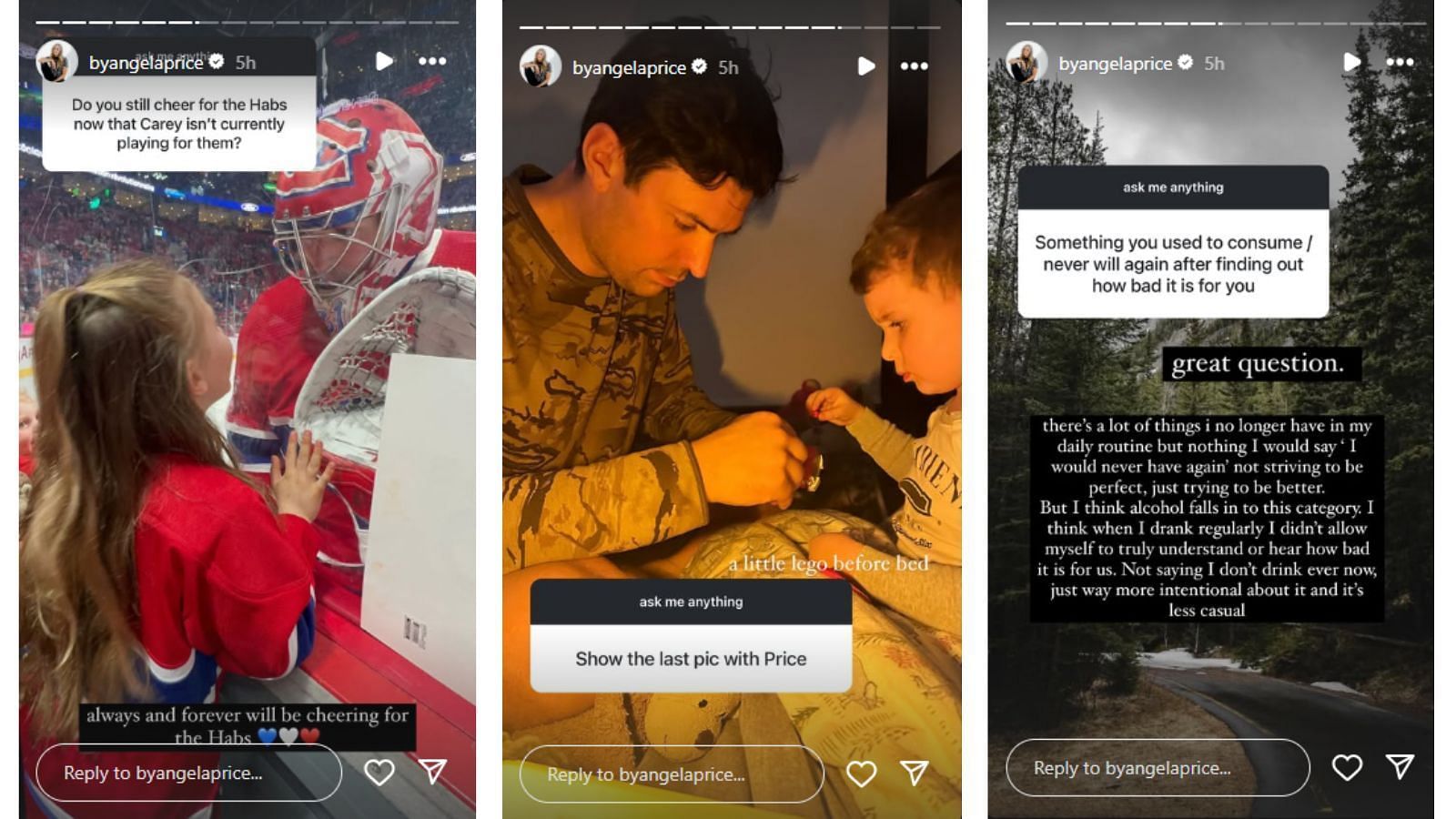 During the same Q&A session, Angela Price addressed one question from a follower who asked if she still supports the Habs even though her husband Carey Price is no longer playing for the team. In response, Angela wrote: