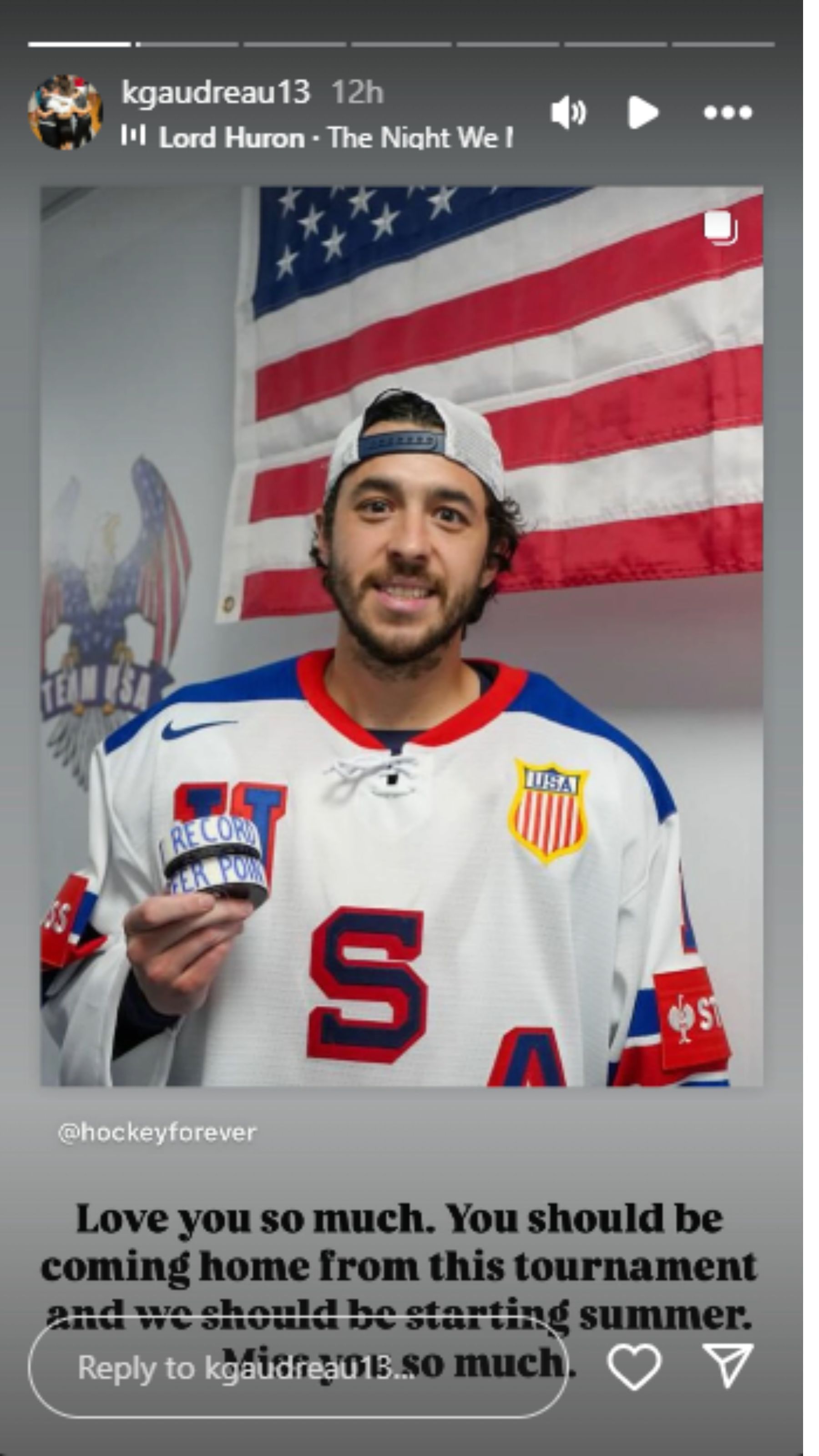 On Tuesday, Johnny’s sister Kate Gaudreau shared a post from Hockey Forever’s Instagram account featuring monets from the special tribute Team USA paid in honor of her late brother. The carousel featured a throwback photo of Johnny’s holding a couple of ceremonial pucks in Team USA gear.
