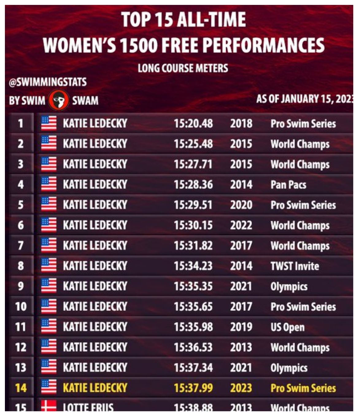 Her dominance in the sport can be backed by facts and figures, setting aside any sort of luck associated with medal-winning swims. Ledecky, who swam in the 2023 Pro Swim Series in Knoxville and won the women’s 1500 freestyle with a time of 15:37.99, now owns the top 14 spots in the top 15 fastest 1500 list. Her latest outing contributed to this by taking the 14th place. Here is the list of the fastest female 1500-meter swims: