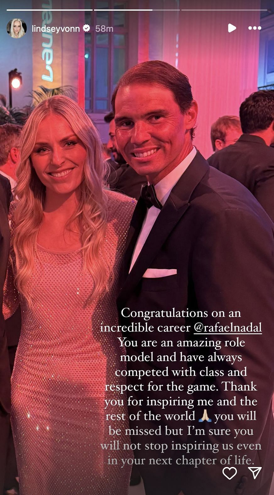 As Rafael Nadal embarked on the final tournament appearance of his career, the sports world has been paying tributes as well as sharing farewell notes to celebrate his illustrious career. Lindsey Vonn, who has been a huge tennis fan and is often spotted watching major tournaments, took to Instagram to pen a heartfelt note.