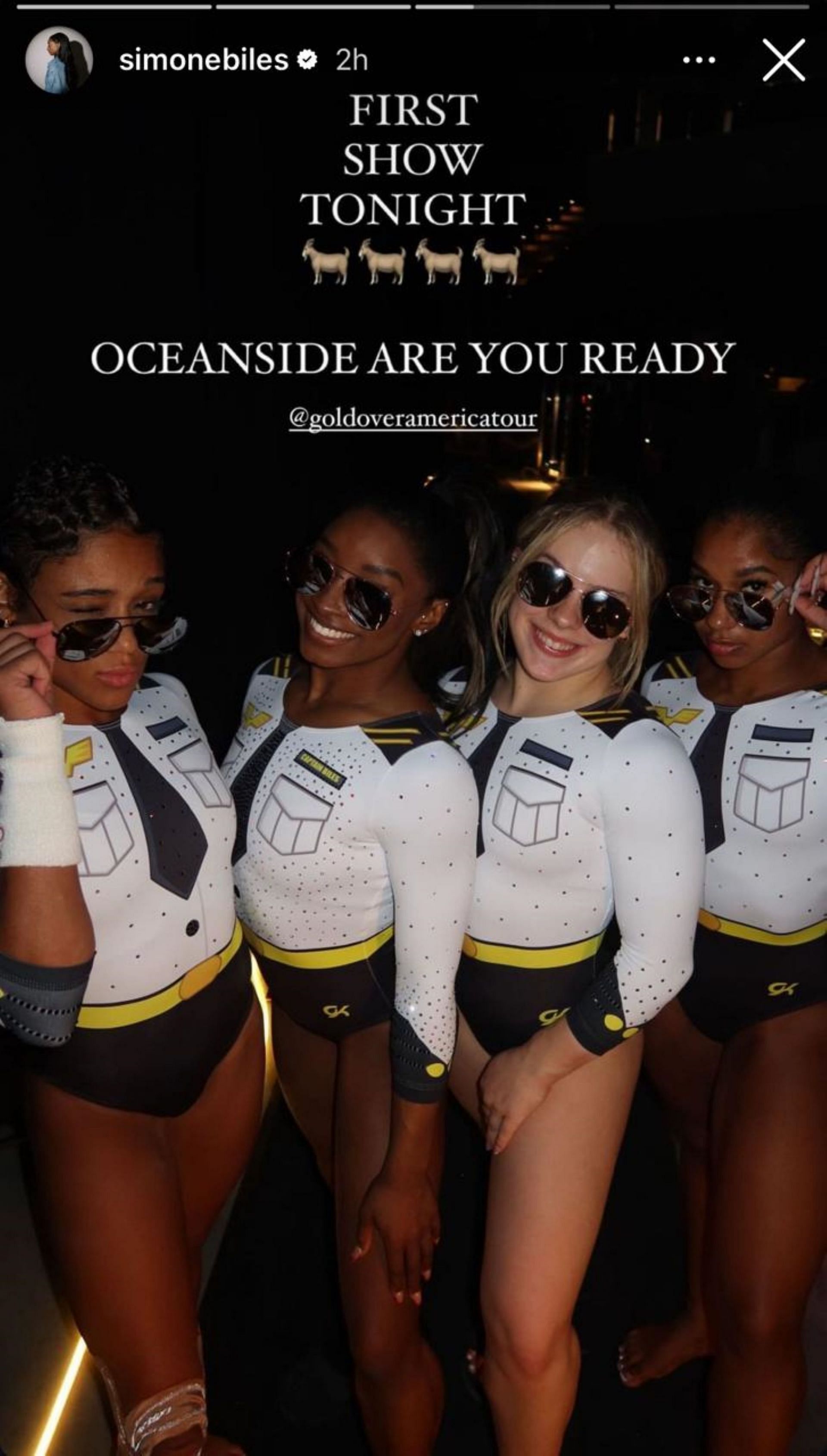 In her following story, Biles, Jordan Chiles, Joscelyn Roberson, and Melanie de Jesus dos Santos showed off their police uniform-inspired leotards and sunglasses.