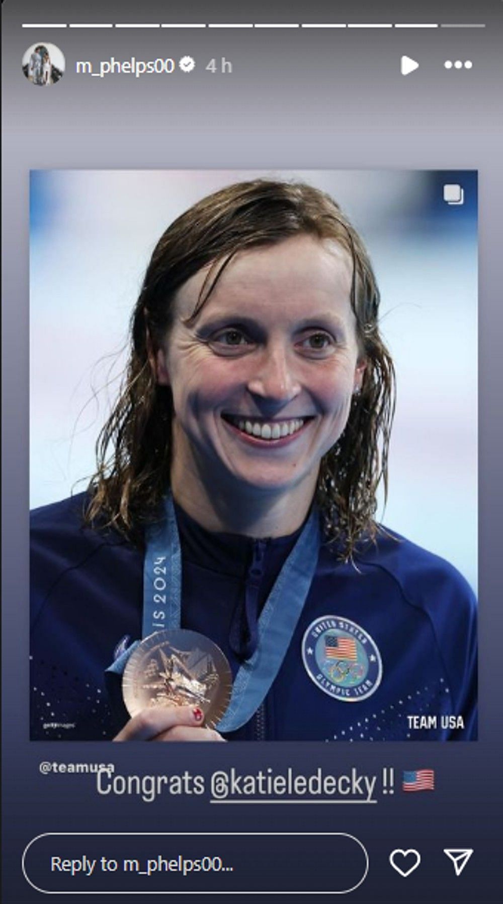 America's beloved swimmer Katie Ledecky also received praise from the legendary swimmer for bagging her first medal of the 2024 Games edition. Ledecky settled in third place after posting 4:00.86 in the women's 400m freestyle. She was surpassed by Ariarne Titmus and Summer McIntosh.