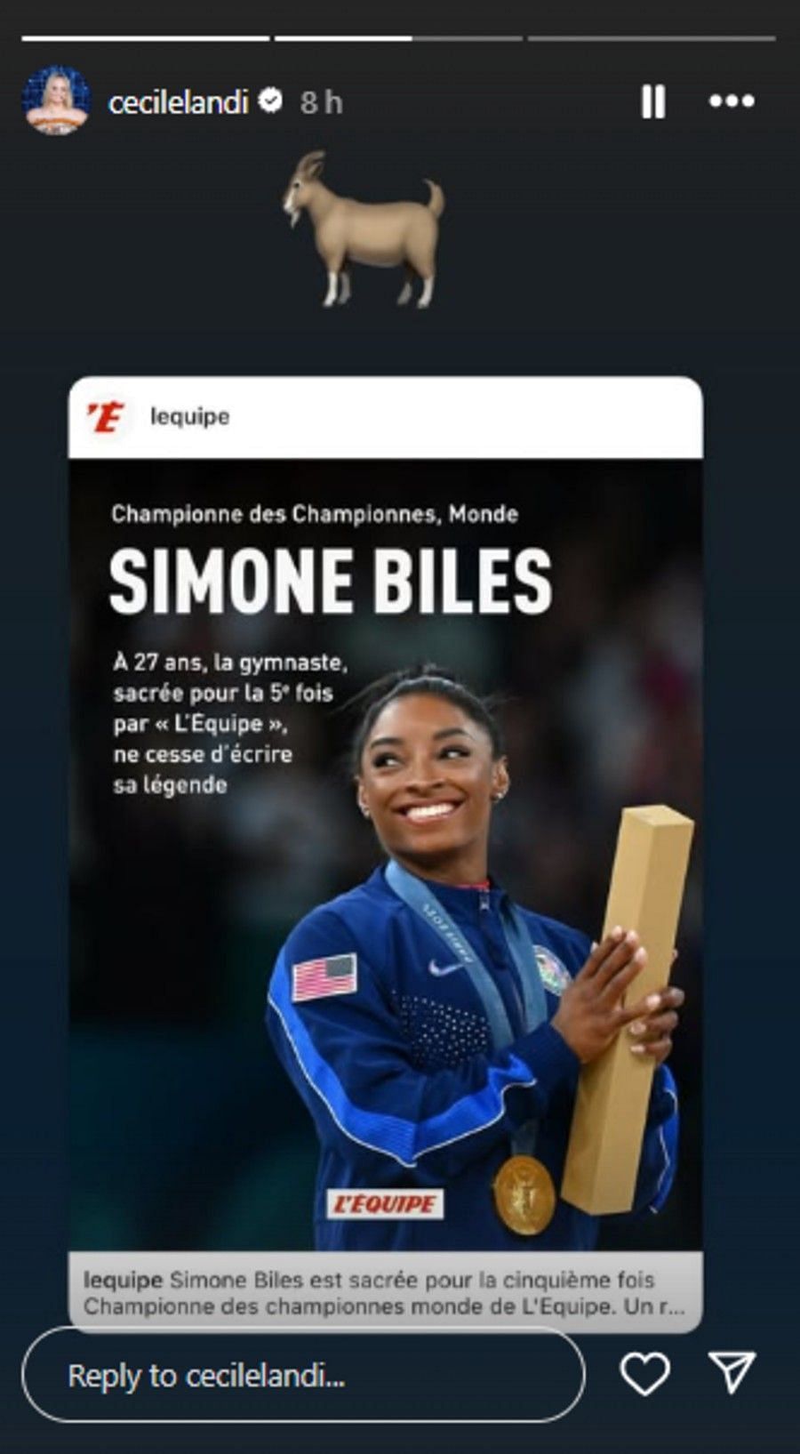 Biles' former coach and former French gymnast Landi reacted to the multiple-time Olympic medalist earning the award by sharing the news on her Instagram story and adding a goat emoji, indicating Greatest Of All Time (G.O.A.T).