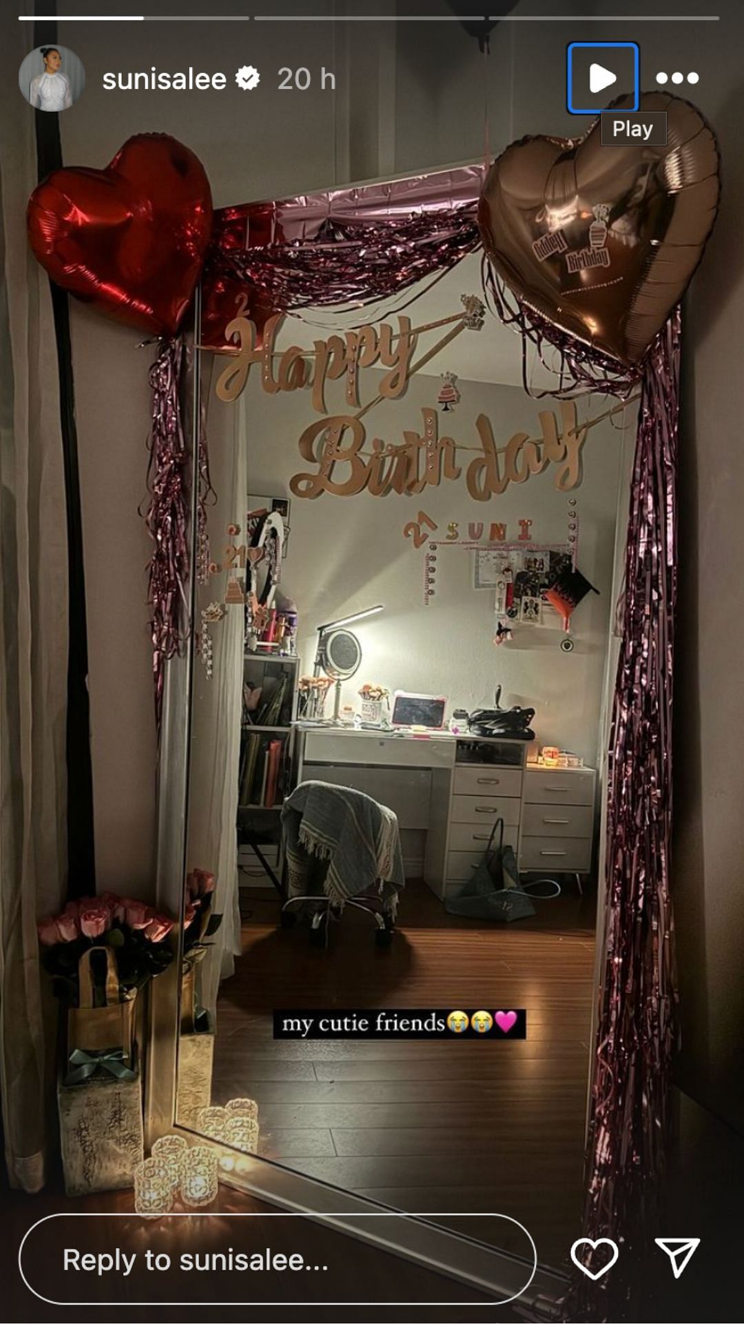 Lee shared a glimpse of the surprise via an image on her Instagram story. It displayed her room, which had been beautifully decorated by her friends. The room had a giant mirror which was decked up with pink tassels and red and yellow balloons.