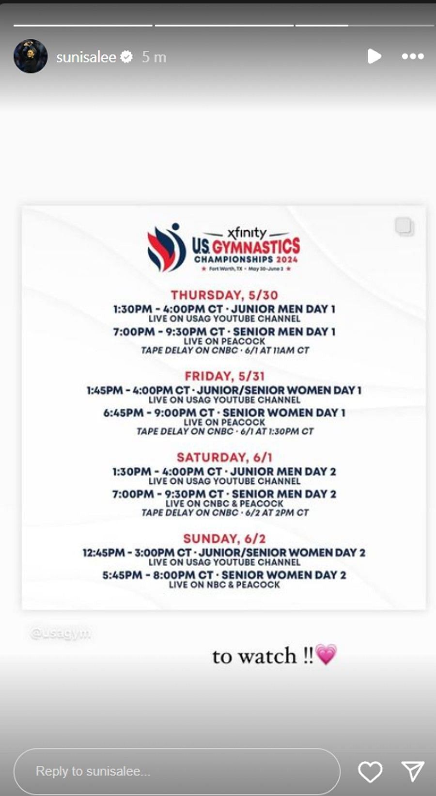Suni Lee recently encouraged the fans to watch the 2024 Xfinity U.S. Gymnastics Championships as she gears up to compete in the all-around event for the first time in the Olympic year. Lee competed in the floor exercise, balance beam, and vault at the 2024 U.S. Core Hydration Classic on May 18, in Hartford, Connecticut.